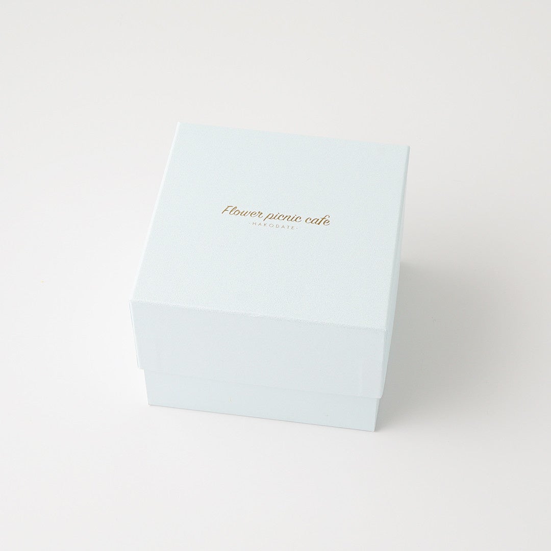 まるで生花のような透明感。開けた瞬間、花のような笑顔咲く、食べられるお花のボックスフラワーケーキ。父の日専用BOXは、ヒマワリとアジサイがよく映えるブルーでアレンジ。大切なお花は一枚一枚、心を込めて丁寧に絞らせていただきます。