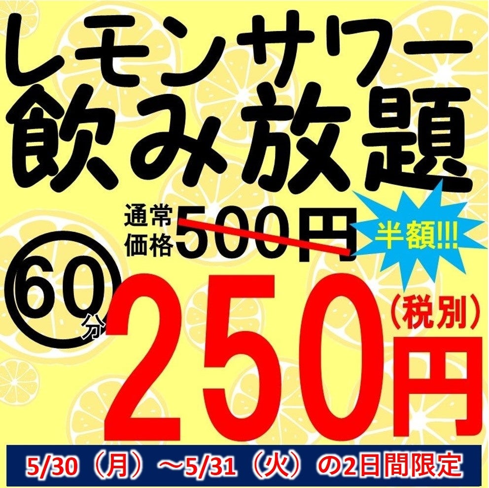 名物レモンサワー飲み放題が通常価格60分500円(税込550円)のところ、5/30(月)~5/31(火)までの2日間、60分250円(税込275円)でお楽しみいただけるキャンペーンを行います。