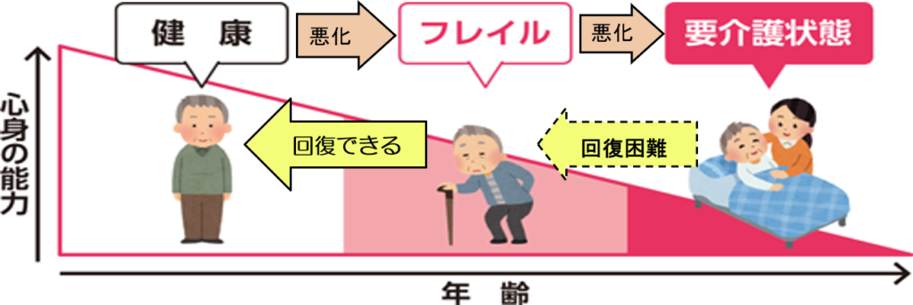 高齢者人口は25%を超え、2025年には、75歳以上の後期高齢者が2,000万人を超えることが予想され、75歳以上の後期高齢者における要介護の原因の1位は虚弱(フレイル)である。フレイルはそのまま直訳すると「虚弱」で「健康な状態と要介護状態の間の状態」と捉えており、この状態は生活を見直すと改善することができる。75歳以上になると35%の人がフレイルと診断されており、フレイル状態になると、2年間のうちに要介護状態になるリスクは健康な人にくらべ4.8倍になる。
