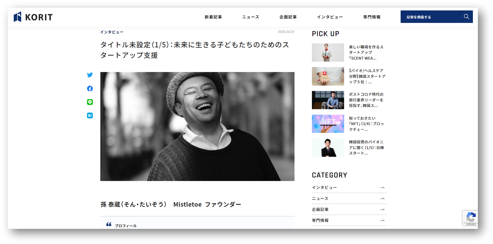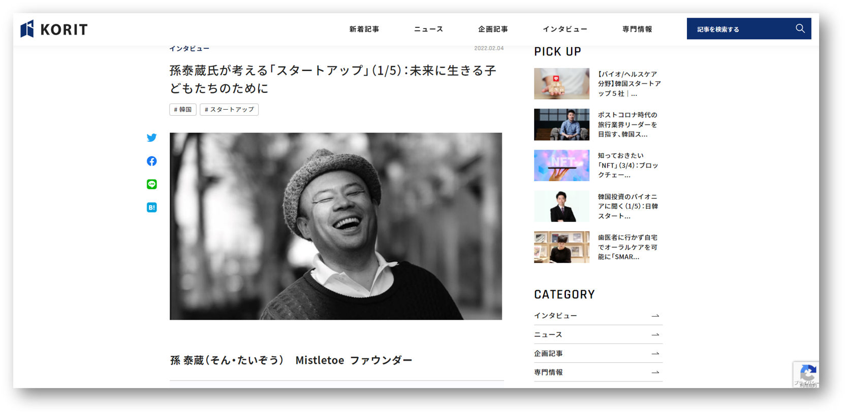 日韓ビジネスを専門的に取り扱う会計事務所・株式会社スターシア(本社:東京都千代田区、代表取締役:黄泰成)は、韓国IT・スタートアップ業界の最新トレンドを日本語で発信する専門Webメディア「KORIT」を2022年2月7日正式オープンいたしました。正式オープンを記念し、Mistletoe(ミスルトウ)ファウンダーの孫泰蔵さんにスペシャルインタビューを行いました!