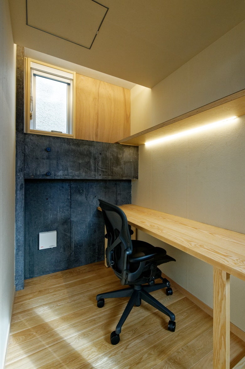 間接照明と天井の高低差により、1日を通しての個室ワークでも閉塞感を感じにくい空間となっております。専用デスクのワークチェアには、アームレスト付きタイプのAeron Chairを採用し、ワークタイムのパフォーマンス向上を重視しました。廊下に面するガラス扉にはロールカーテンがついているので、プライバシーにも配慮しています。
