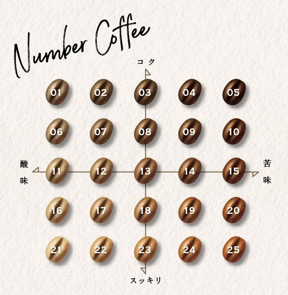ナンバーコーヒー(Number Coffee)は、苦味・酸味・コク・スッキリの軸を指標として分布された25の数字から、その時の気分によってセレクトできるドリップコーヒーです。