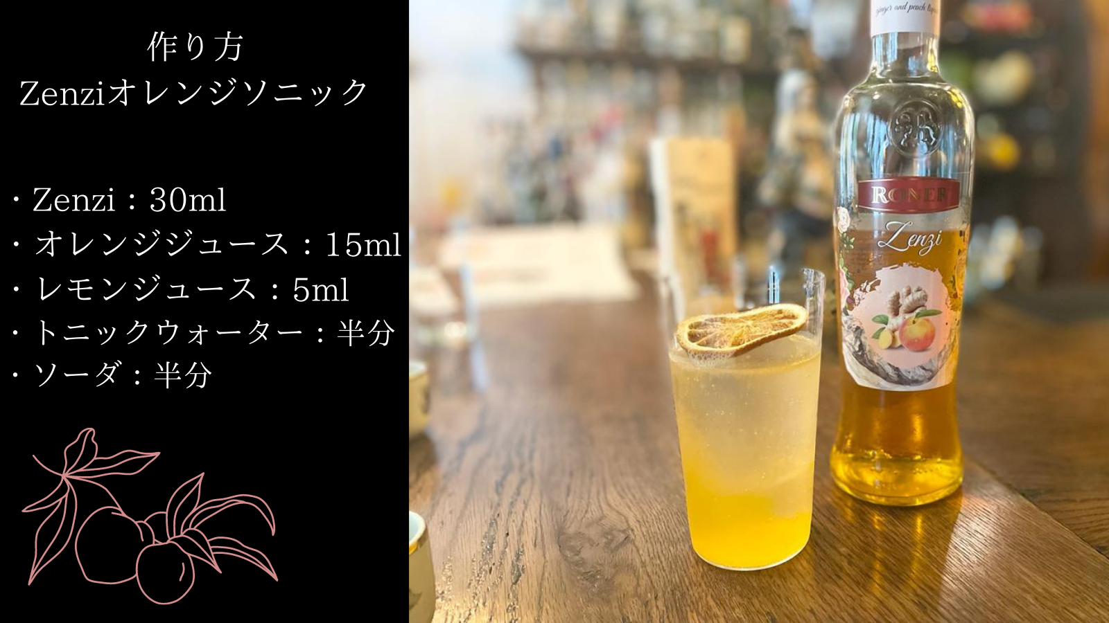 Zenziをベースにオレンジジュース・レモンジュース・ソニックを加えたシンプルなカクテルです。簡単に作れて抜群に美味しい!オレンジジュースやソーダの割合で甘さの調節もできます。