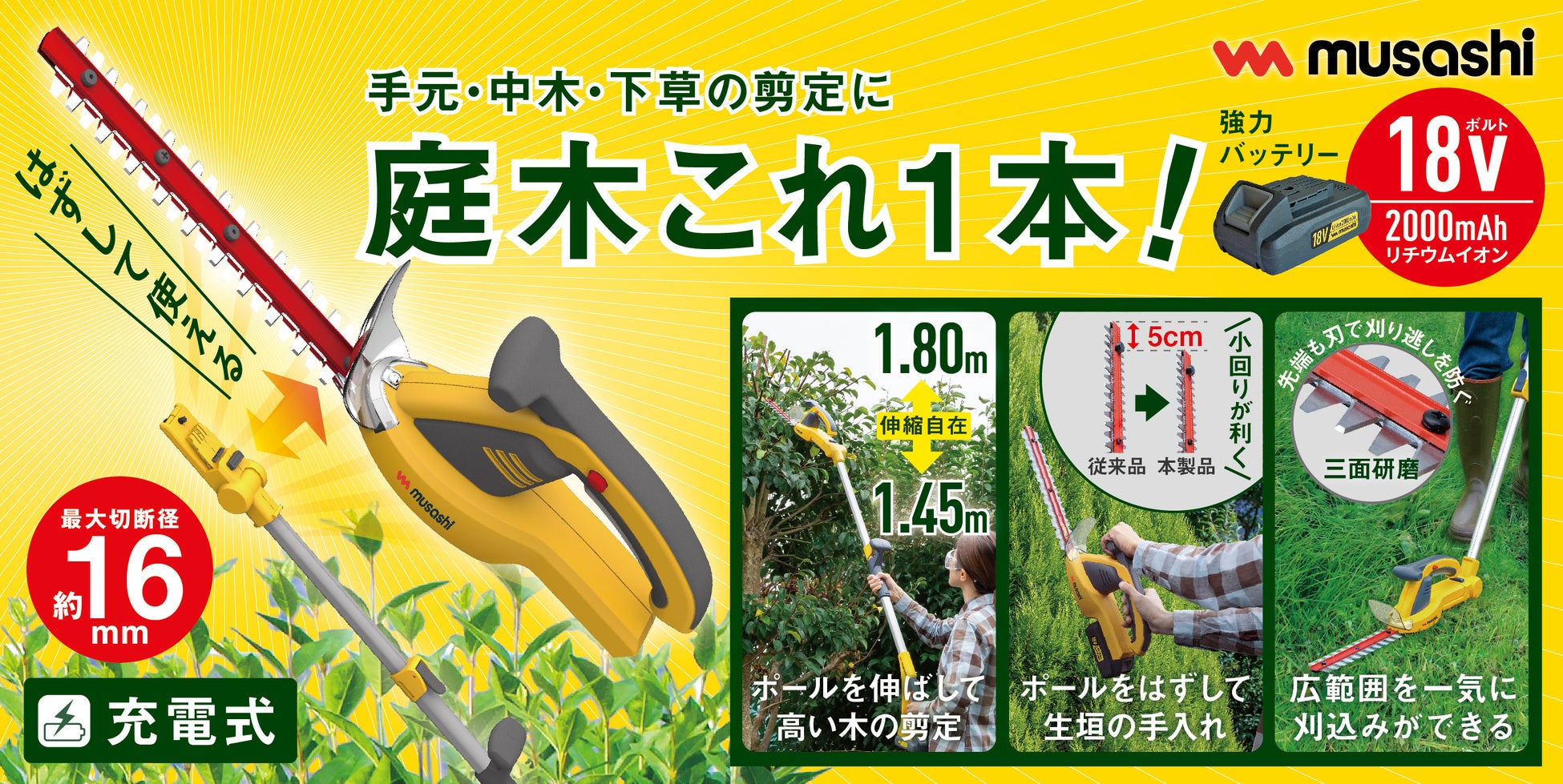 株式会社ムサシ(兵庫県加古川市、代表取締役社長:岡本篤)は、ヘッドを外せる伸縮バリカン「充電式ハンディ&ポールバリカン」(18Vリチウムイオンバッテリーシリーズ)をホームセンター等で発売します。