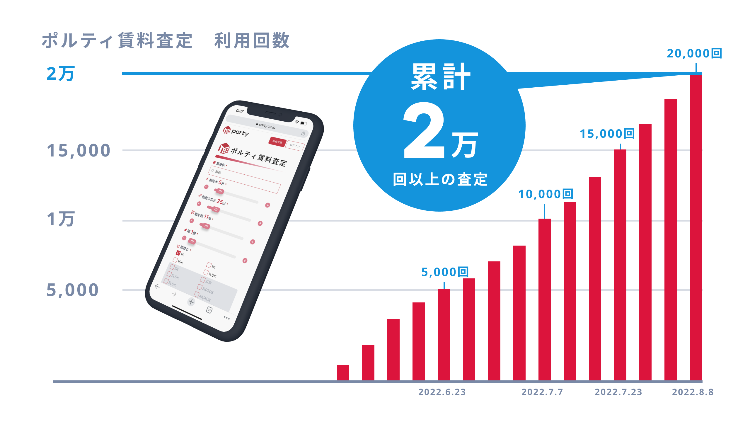 ポルティは2022年6月7日に『ポルティ賃料査定』のβ版をリリースいたしました。これまでに累計2万回以上の査定が行われ、一部有料サービスは東証プライム市場に上場されている企業様にもお使いいただいております。(2022年8月10日時点)