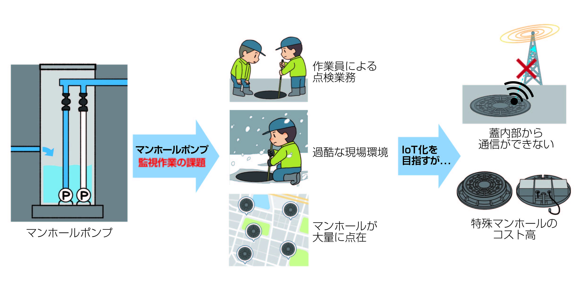 この度、地下に埋設された下水道施設・通信管路の点検口蓋として使用する鉄蓋を据えおいたまま、鉄蓋内部から通信できるLoRa250mW高出力無線のテクノロジーを活用して点在する鉄蓋内部の設備点検と異変察知を実現し、センサーと広域無線を組み合わせたスマートIoTで過酷な労働環境や人材不足を解消して安全・効率的に点検作業を行える「マンホール内部の設備監視」を2022年5月14日から提供開始いたします。