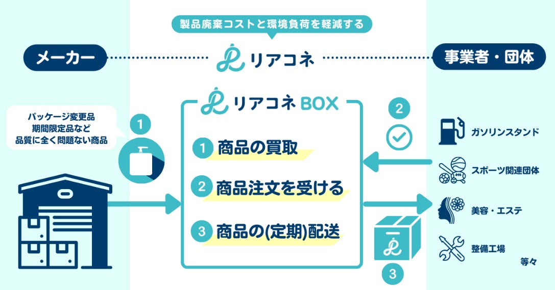 非耐久消費財メーカー(日用品、加工食品、化粧品等)の廃棄予定品を小売店で購⼊したユーザーに、ポイント還元・キャッシュバックすることで日用消耗品の廃棄ロスを軽減するデジタルサービス「リアコネ」を運営する株式会社リアコネ(本社:東京港区、代表取締役:服部昂)は、2022年3月より、提携メーカー様の滞留在庫品等の通常の販売ルートでの販売が難しい製品を買い取り、それらをクローズドマーケット内で特定事業者(例:ガソリンスタンド・エステティックサロン・スポーツ関連団体・各種工場・福祉施設等)に販売する新BtoB販売サービス「リアコネBOX」を開始いたします。