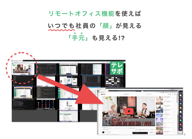 就業中の全社員の画⾯を一覧表⽰できるため、業務と関係のない動画やネットサーフィン、⻑時間⼿が⽌まっている社員がいればすぐにサポートに入る事ができる等、サボり抑制としても⼤きく働きます。在宅でのリモートワークであっても、お互いに集中⼒をもって業務に取り組める環境を構築できるよう⽀援します。