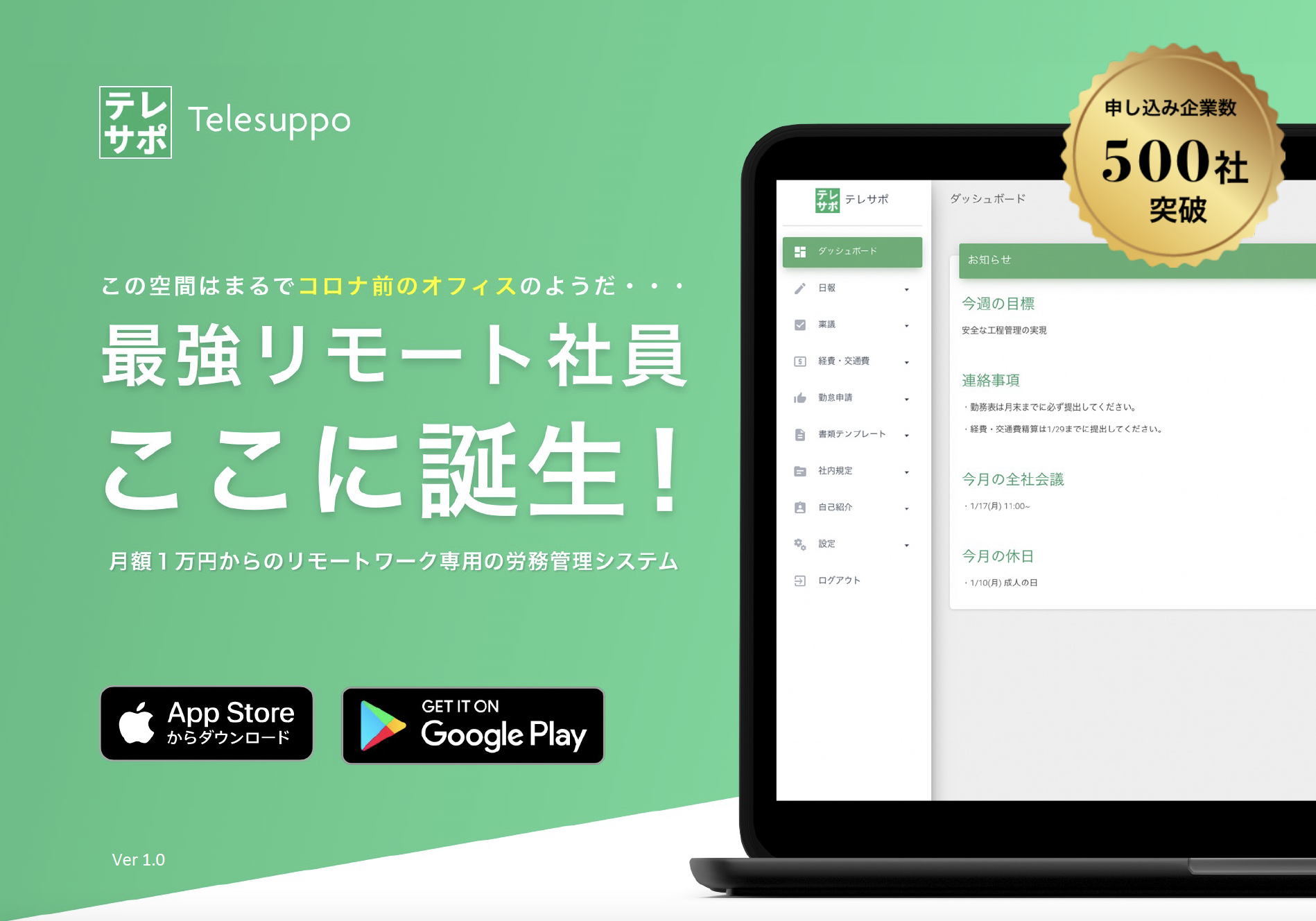 【 ⽉額1万円〜日本初!リモートワーク専用のリモート管理システム 】社員への面倒な導入説明やマニュアル提供は必要無し!誰でも簡単シンプルに使える『テレサポ』が遂に提供開始!