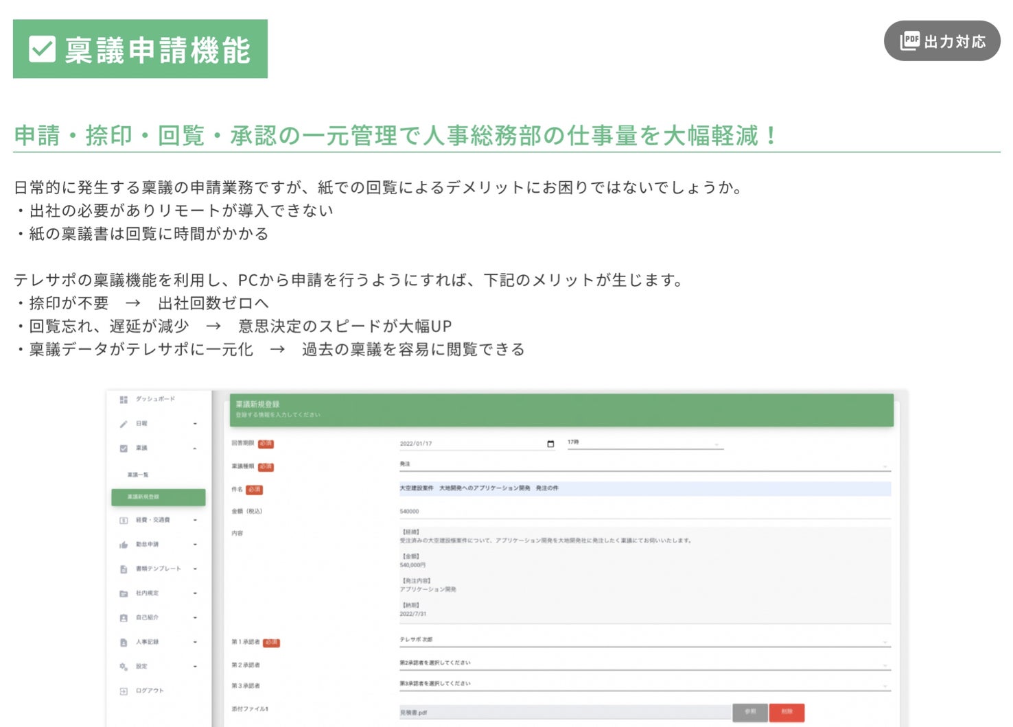 また、稟議申請や経費精算のような従来であれば出社して書類に押印、回覧という⼀連のフローを必要とする業務も、スマートフォンやパソコンから簡単に作業を完結でき、上席の承認・回覧状況の確認も容易にします。『テレサポ』導⼊は結果的に人事総務部の圧倒的な仕事軽減にも繋がっております。