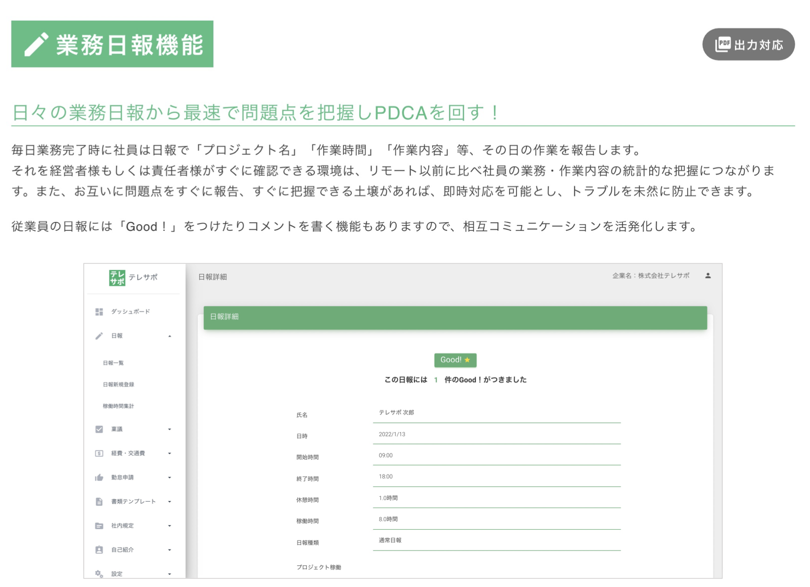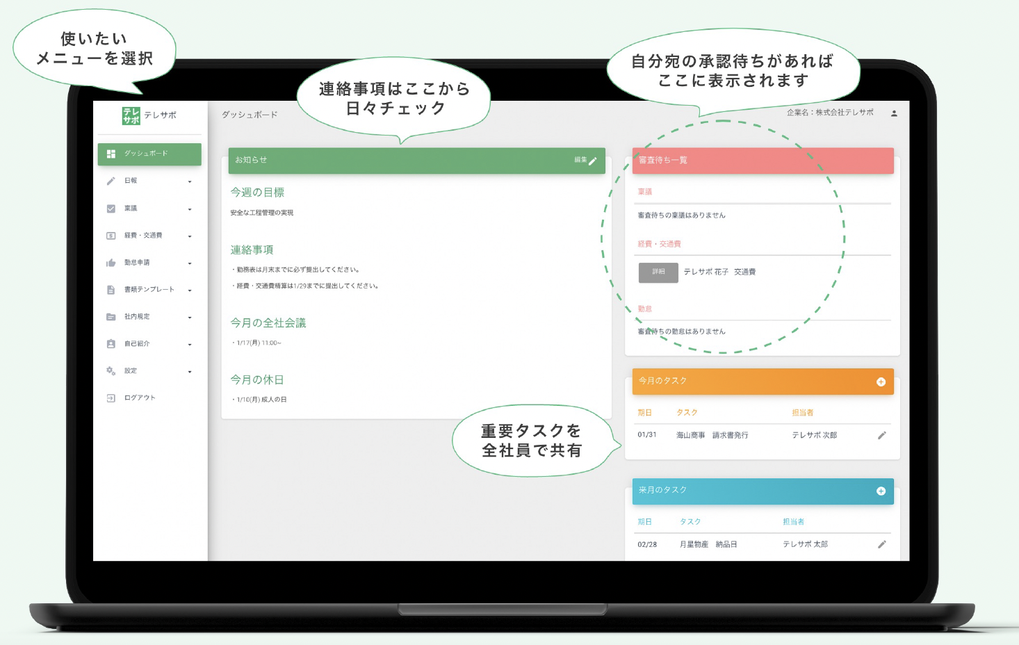 『テレサポ』では、「業務日報」や「稟議申請」「勤怠管理」「経費精算」のような労務管理の機能はもちろん、常時接続を可能とする「リモートオフィス機能」を搭載し、まるでオフィスにいるかのようなコミュニケーションを実現します。
