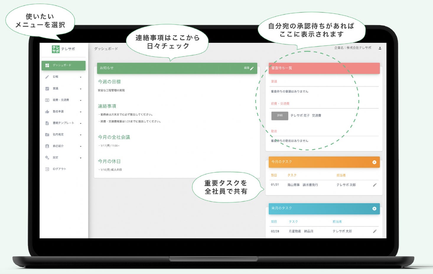 ■大切な業務連絡の通達や稟議・経費の申請→承認→回覧もテレサポで⼀元管理