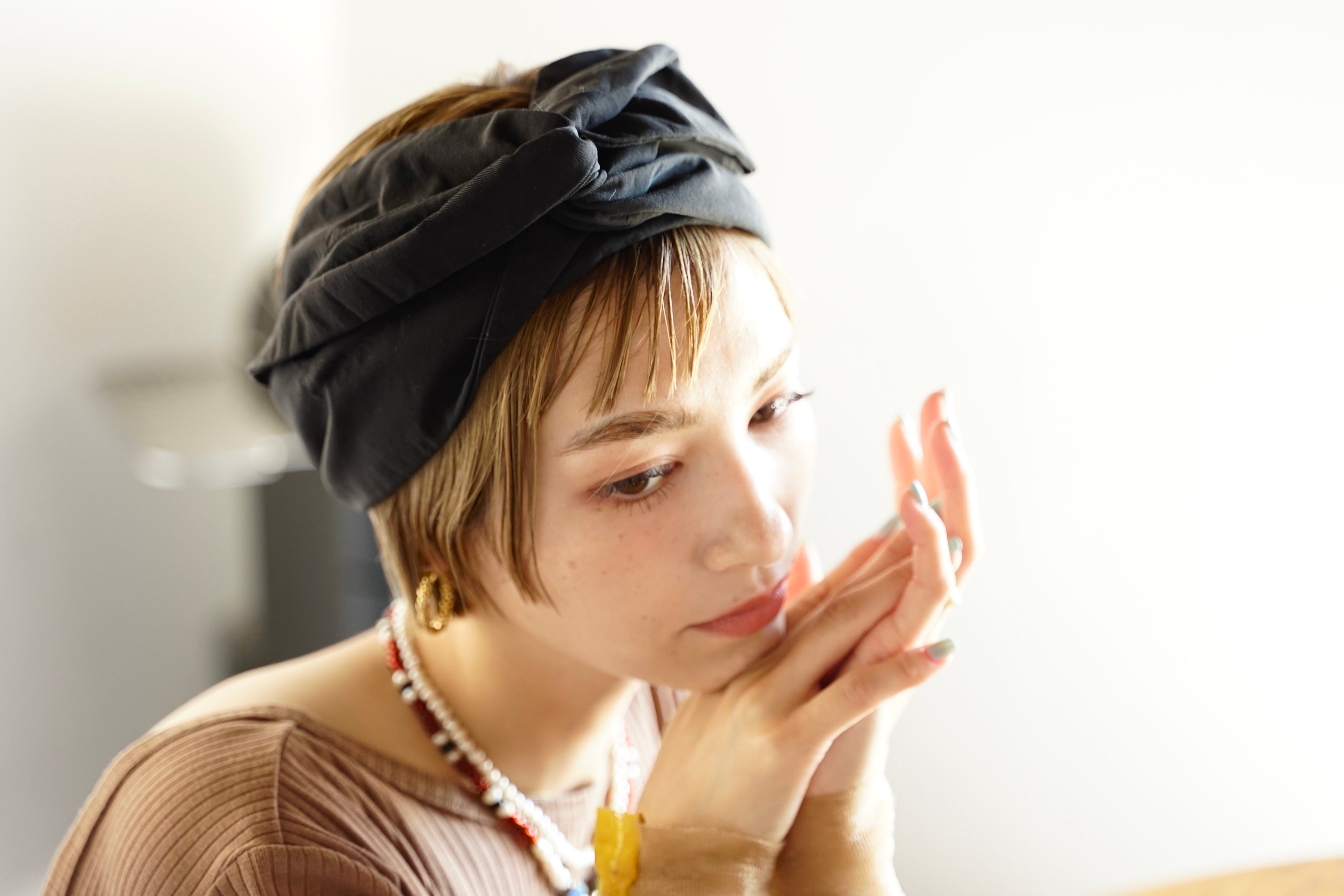 ターバンとして髪をまとめたり、帽子として頭全体をカバーしたり、2wayで楽しめるオリジナルヘアアクセサリーです。 誰でも簡単に着用でき、先端のワイヤー をねじることでシンプルにも華やかにもアレンジが可能です。