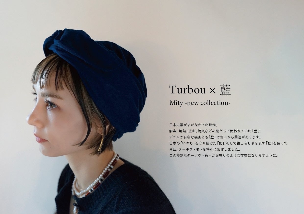 広島県福山市山野町にある藍屋テロワールさんで染めた藍染の特別なターボウです。オーガニックコットンの生地なので肌に触れても柔らかく、先端にワイヤーが入っているため頭の大きさに応じて調整が可能。服装や場面に応じて、様々なアレンジを楽しむことができます。