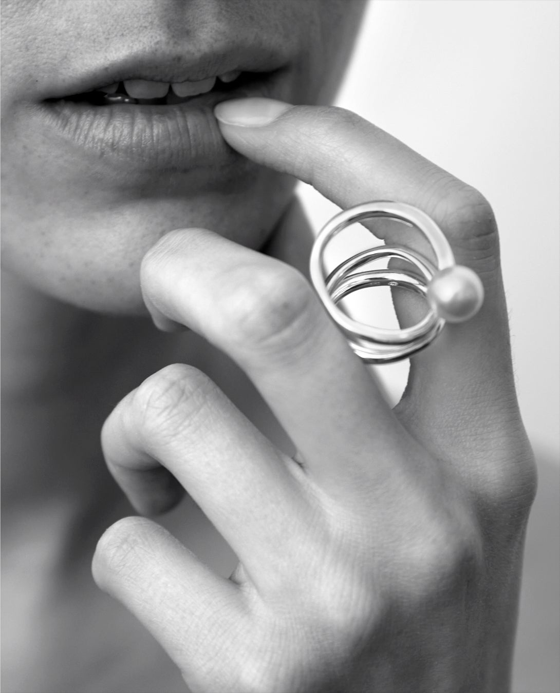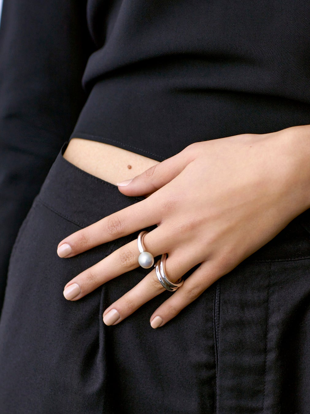 大粒のパールとユニークなフォルムのダブルフィンガーのコンビネーションがよりモードで大胆な印象に。