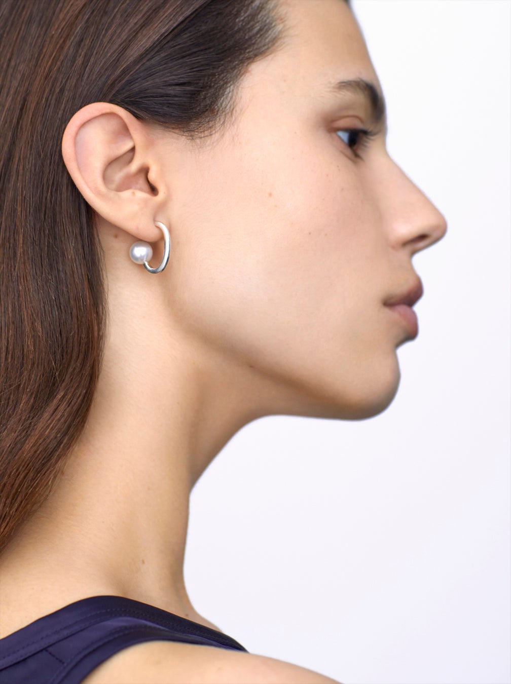 パールは耳たぶの後ろに。主張を抑えたパール使いが洗練されたスタイルを印象付けます。