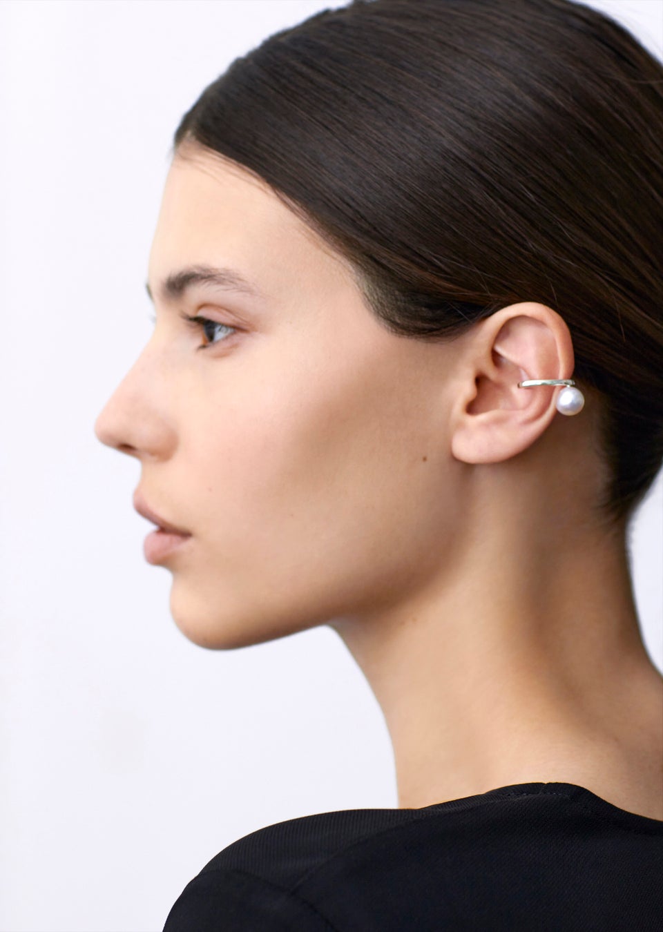 シルバーのスパイラルをパールで留めて。着け方やパールの位置によって変化するイメージを楽しんで。