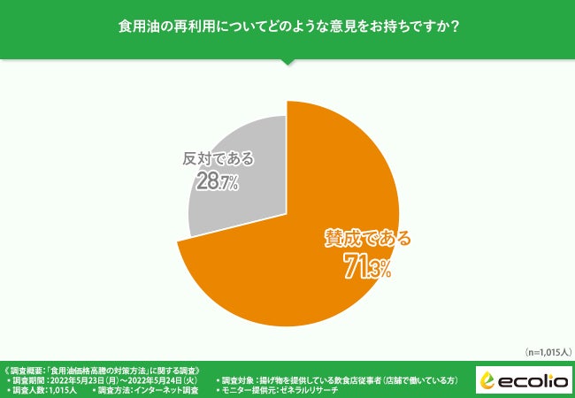 「食用油の再利用についてどのような意見をお持ちですか?」と質問したところ、7割以上の方が『賛成である(71.3%)』と回答しました。