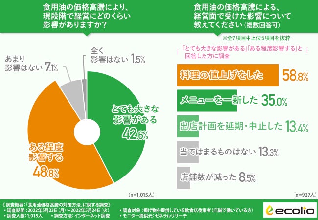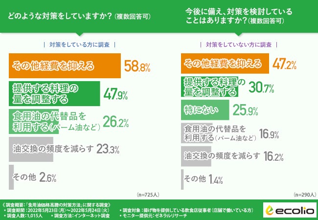 株式会社エコリオ(本社所在地:東京都千代田区、代表取締役:浦野 由紀夫)は、揚げ物を提供している飲食店従事者(店舗で働いている方)を対象に、「食用油価格高騰の対策方法」に関する調査を実施しました。