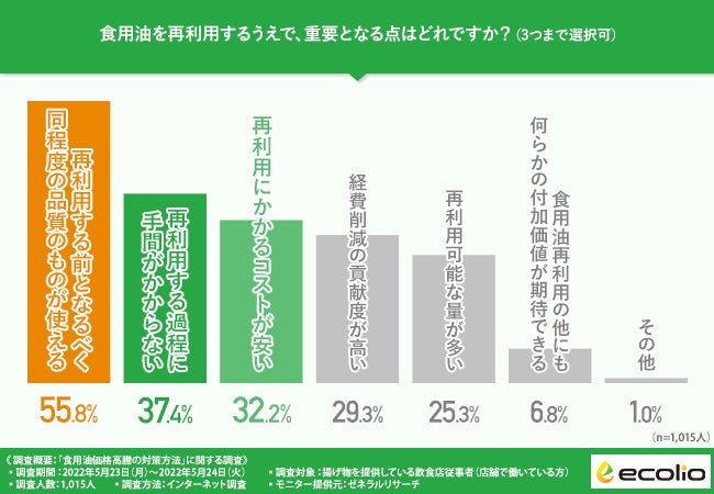 「食用油を再利用するうえで、重要となる点はどれですか?(3つまで選択可)」と質問したところ、『再利用する前となるべく同程度の品質のものが使える(55.8%)』と回答した方が最も多く、次いで『再利用する過程に手間がかからない(37.4%)』『再利用にかかるコストが安い(32.2%)』『経費削減の貢献度が高い(29.3%)』『再利用可能な量が多い(25.3%)』『食用油再利用の他にも何らかの付加価値が期待できる(6.8%)』と続きました。