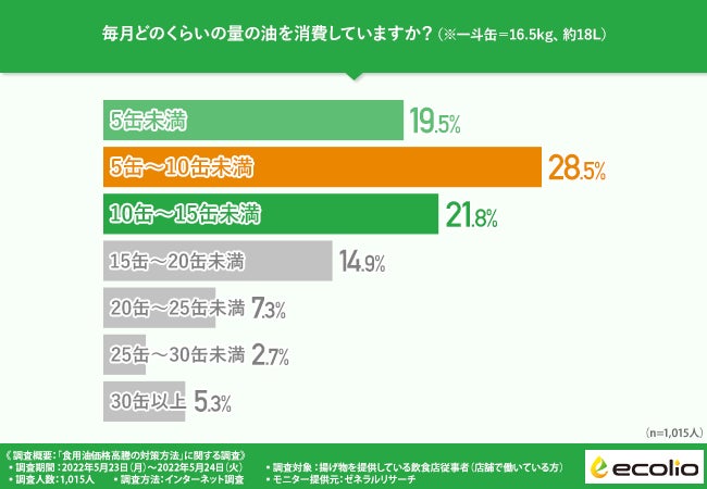 「毎月どのくらいの量の油を消費していますか?(※一斗缶=16.5kg、約18L)」と質問したところ、『5缶未満(19.5%)』『5缶~10缶未満(28.5%)』『10缶~15缶未満(21.8%)』『15缶~20缶未満(14.9%)』『20缶~25缶未満(7.3%)』『25缶~30缶未満(2.7%)』『30缶以上(5.3%)』という結果となりました。