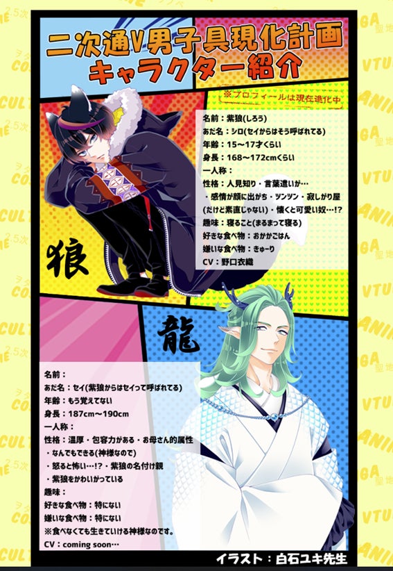 番組記者である野口衣織の「理想の二次元男子を具現化したい」という公私混同の野望を叶えるため、スタッフと番組編集長である吉田アナが奔走。キャラクターデザインは、野口記者の熱望により人気マンガ家、白石ユキ先生に依頼。忙しいスケジュールの合間で、野口記者の妄想をあますことなく詰め込んだ、渾身のイケもふ狼の「紫狼(シロウ)」とイケ青龍「セイ」が爆誕しました。理想のキャラクターの誕生に野口記者も大歓喜!