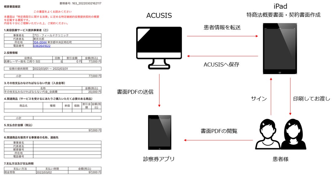 株式会社プロ・フィールド(本社:東京都中央区、代表取締役:車 陸昭)は自由診療に特化した電子カルテ「ACUSIS」の新機能として、iPadで作成できる『 特商法(特定商取引法)書面機能 』を2022年2月にリリースしました。