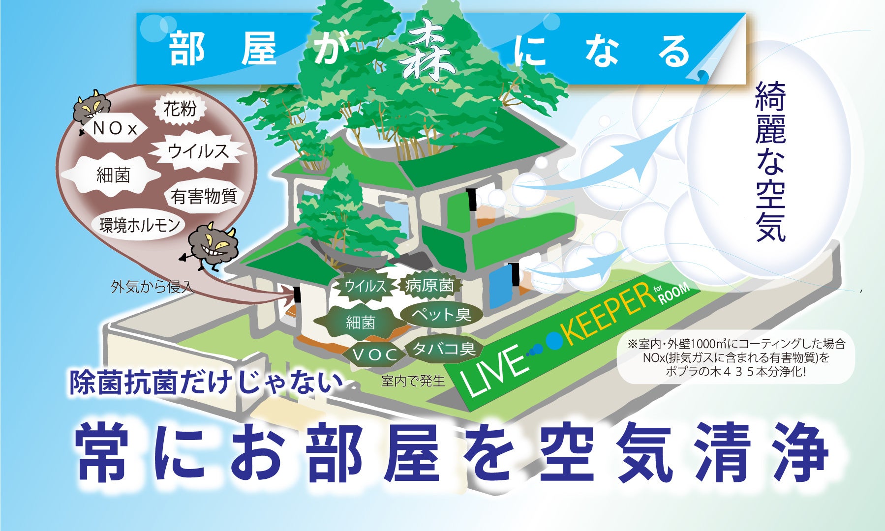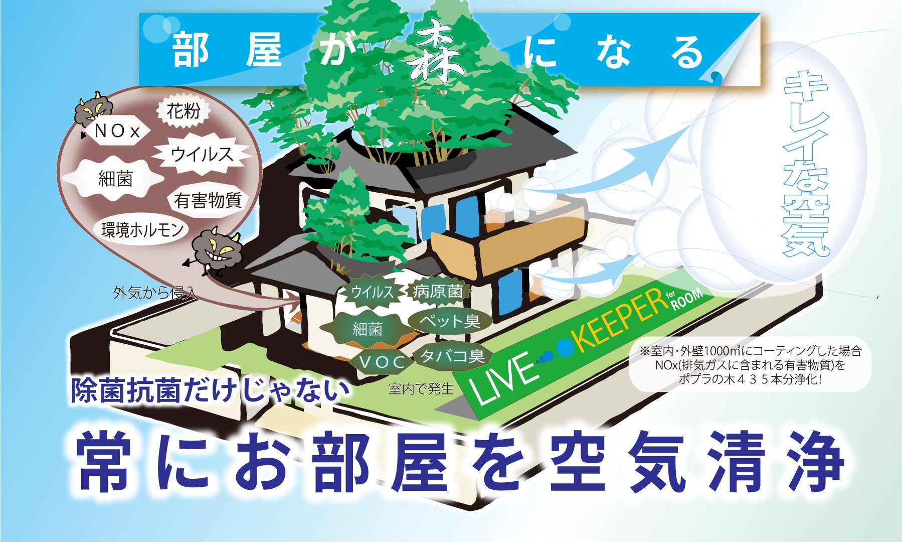 LIVE KEEPER for ROOMはご自宅のお部屋を簡単且つ本格的に光触媒コーティング施工する事が出来るDIY専用の光触媒スプレーです。今まで施工業無しでは不可能であったご自宅やオフィスの光触媒コーティングをご自身で簡単に行うことが出来ます。