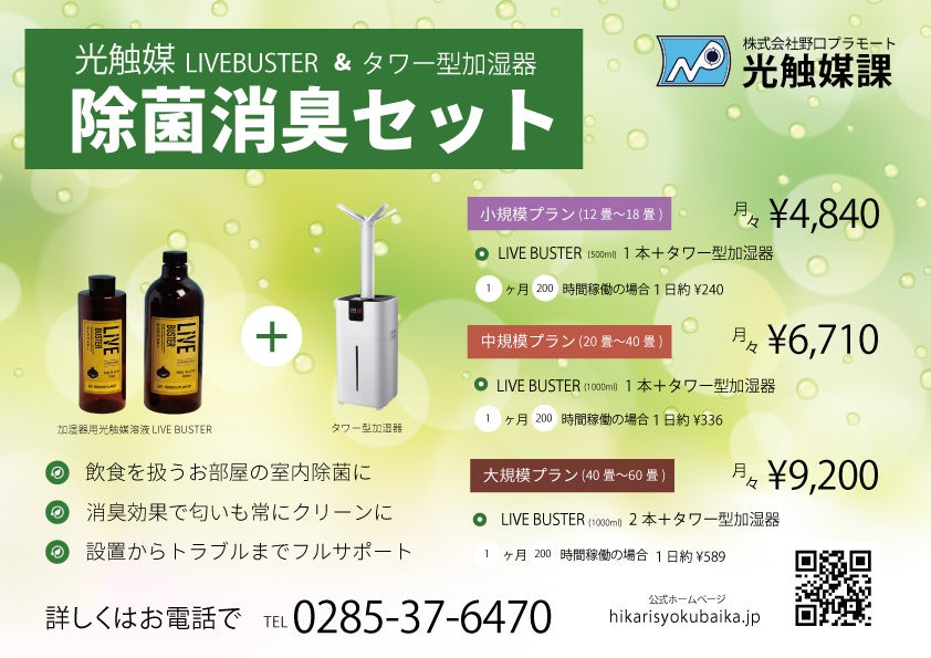 栃木県の企業様、飲食店の事業主様向けにタワー型加湿器と加湿器用光触媒液をセットでレンタル販売を行っております。今までアルコールや次亜塩素酸では不可能だった噴霧での除菌を行うことが出来ます。