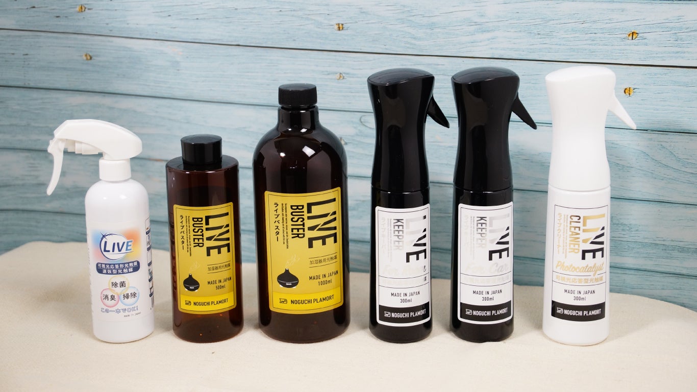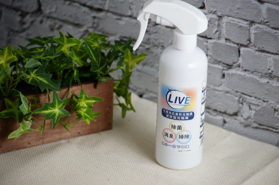 ほかにも、加湿器の給水タンクの中に水と一緒に混ぜるだけで、室内除菌・消臭を24時間行う加湿器用光触媒液LIVE BUSTERや、スニーカーのしぶとい汚れを落とすだけでなく汚れを付きにくくする効果も期待できるスニーカー用光触媒液LIVE SNEAKERなど、様々な利用シーンに合わせた製品の開発・販売を行ってまいります。