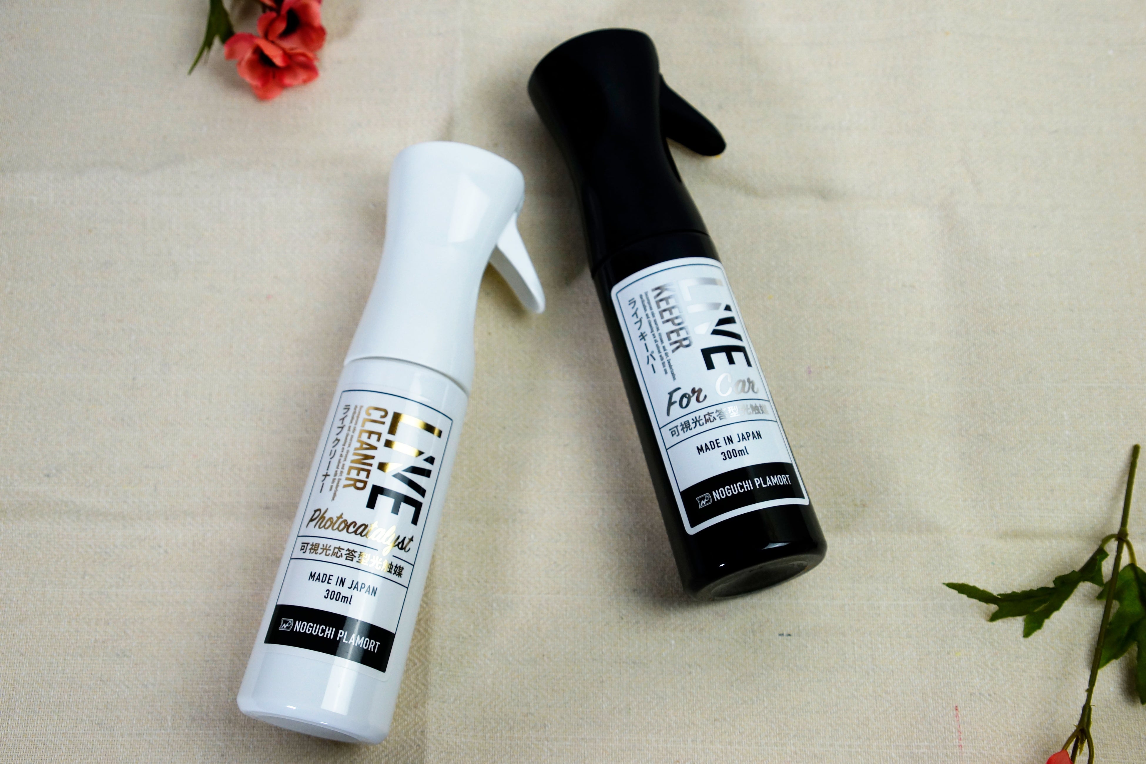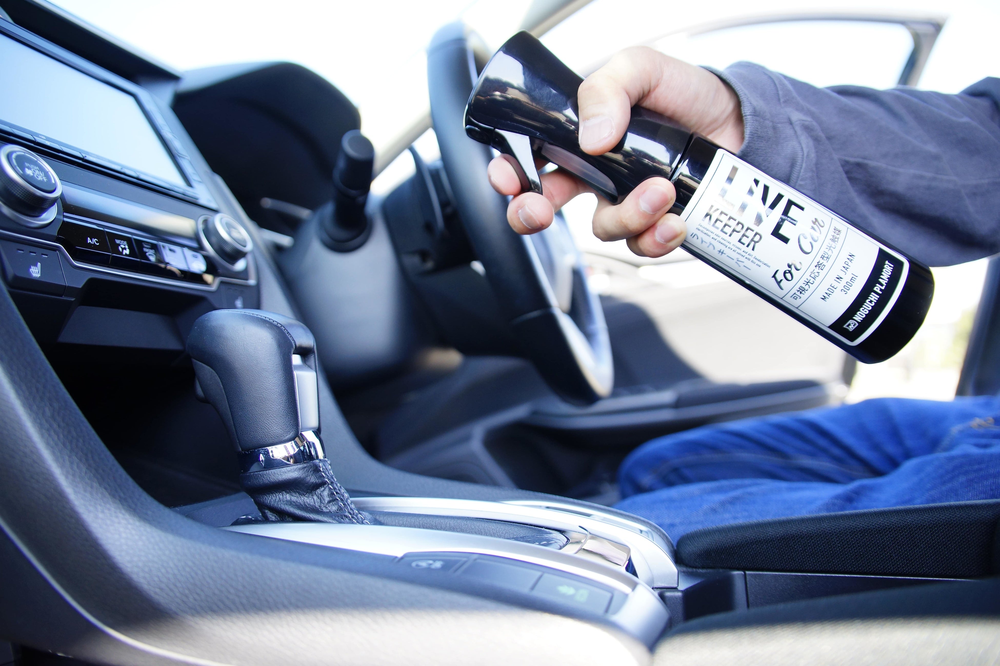 LIVE KEEPER for CARは 自動車の車内を簡単且つ本格的に光触媒コーティング施工する事が出来る車内専用の光触媒スプレーです。施工業者無しでは不可能だった、お車の清掃から抗菌まで2本の高濃度酸化チタンスプレーを使い実現します。1本で車内の消臭・汚れ落とし・除菌を行いもう1本でコーティングを行います。2本の光触媒スプレーで綺麗になった車内を匂いやウィルス等から守り続けます。