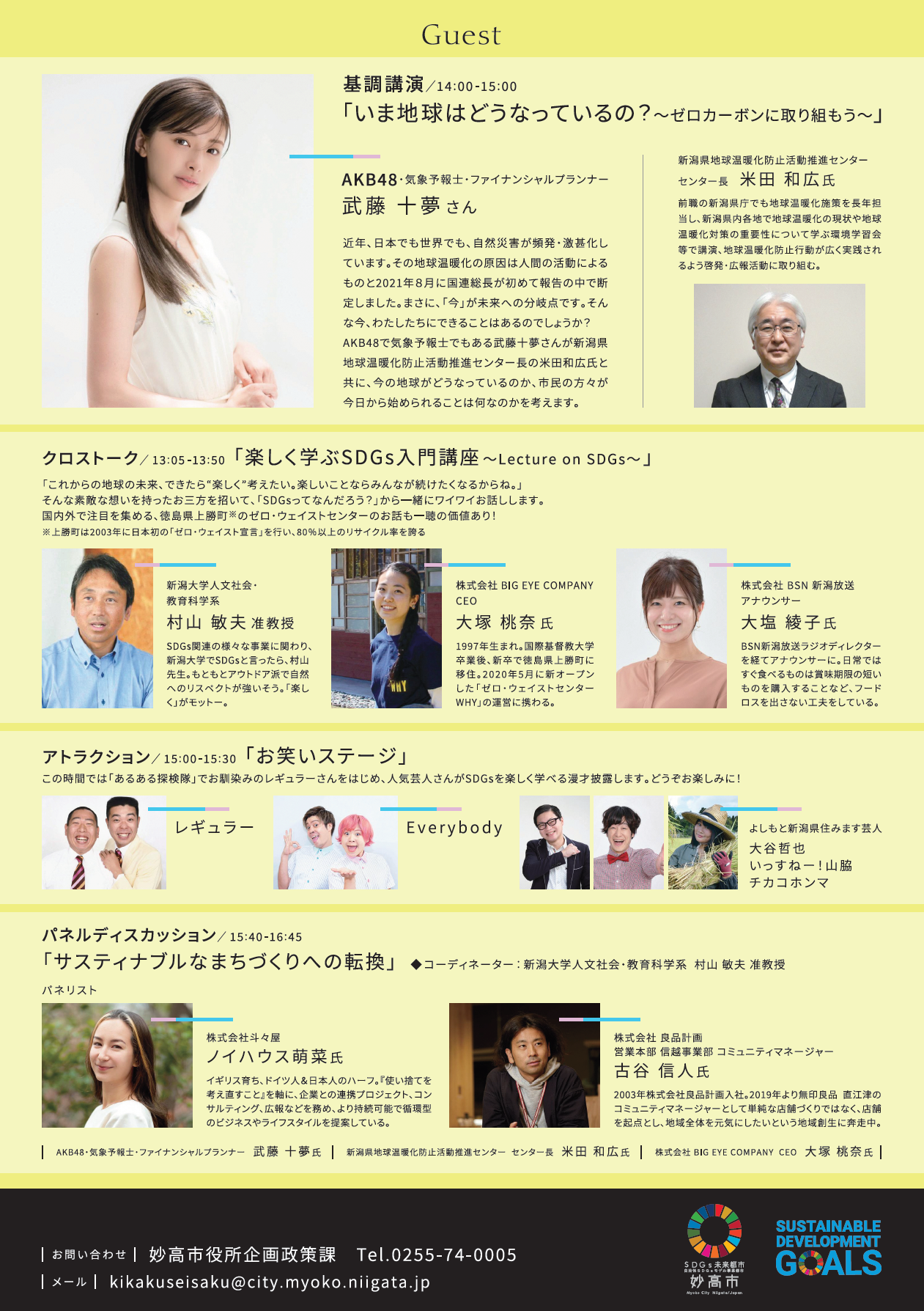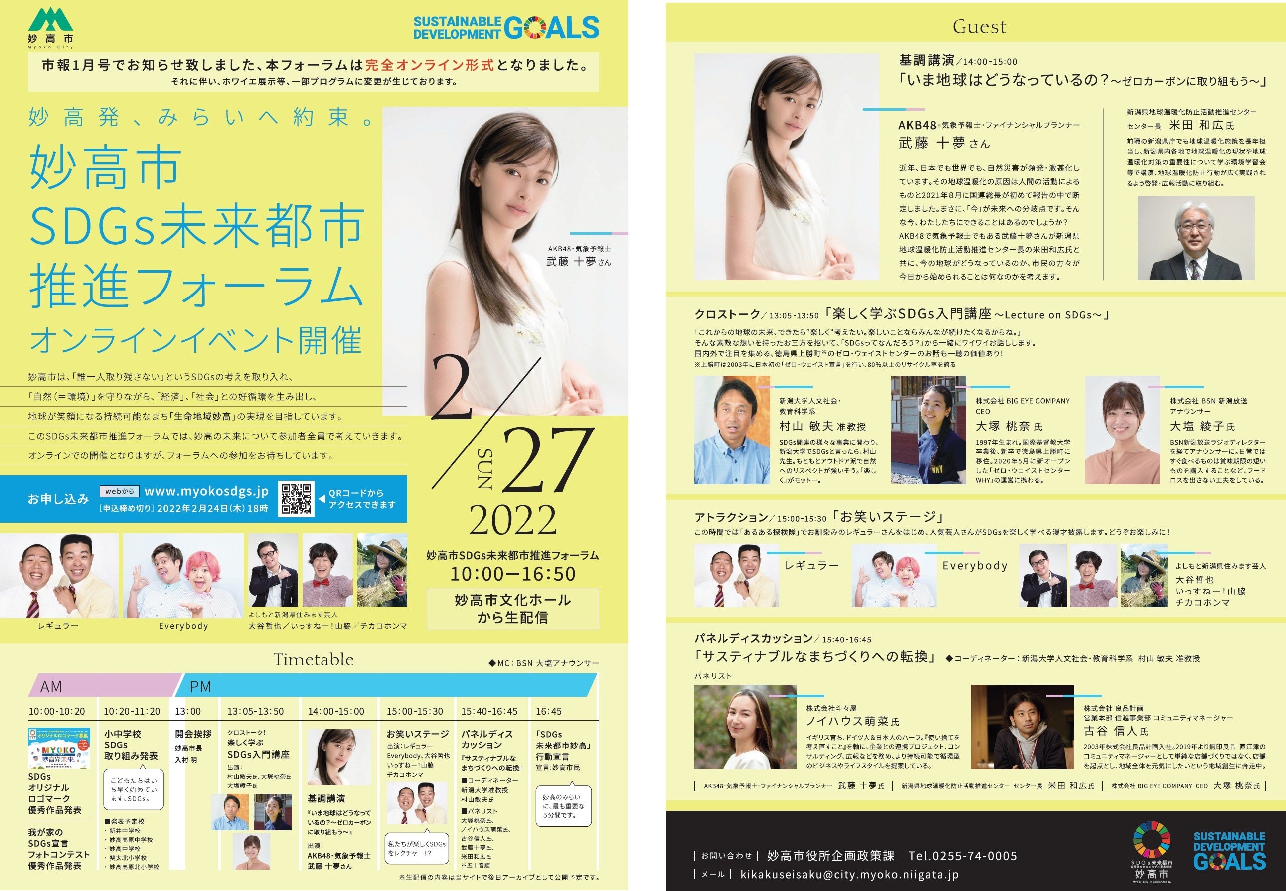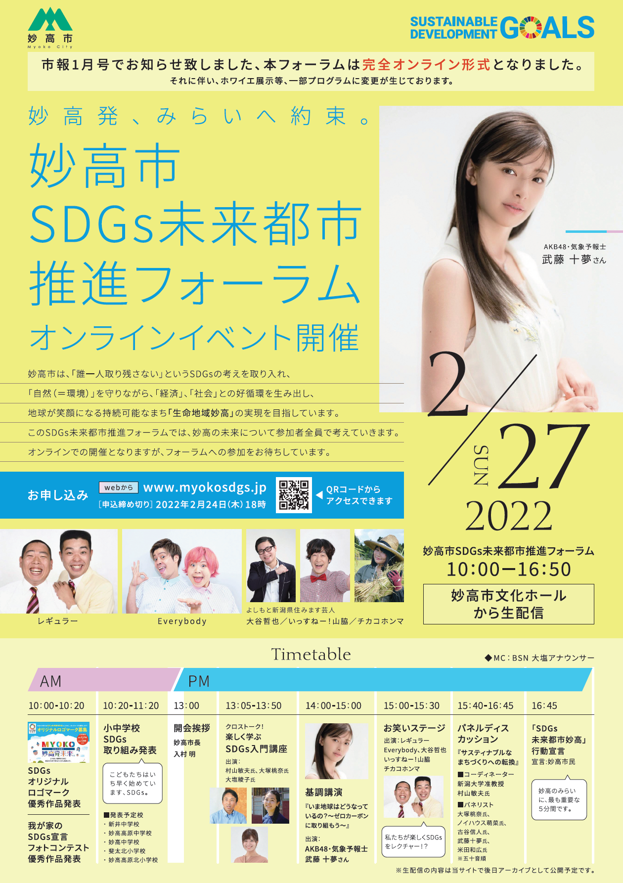 AKB48で気象予報士の武藤十夢さんやよしもと芸人をはじめ、多彩なゲストとともに、妙高の未来、日本の未来、世界の未来について考える「妙高市SDGs未来都市推進フォーラム」をオンラインで無料開催します。