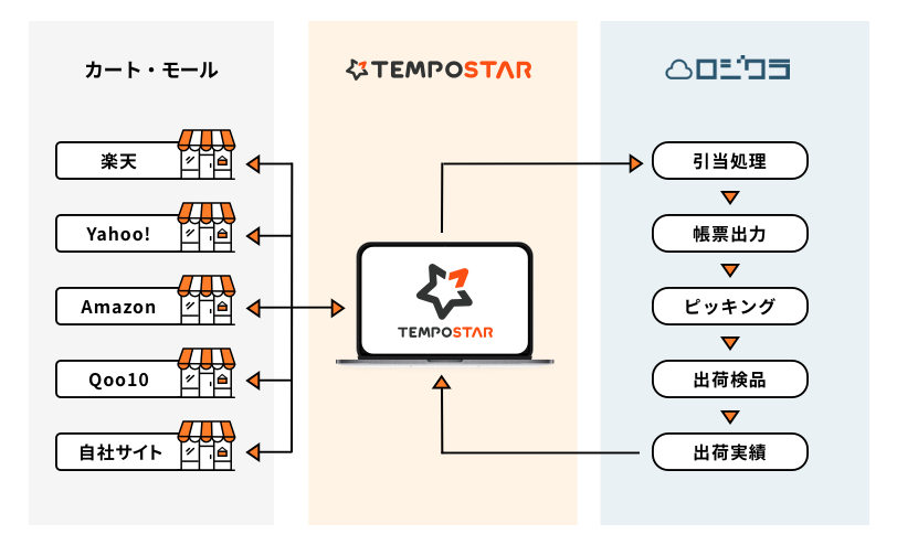 このたび、TEMPOSTARはロジクラ専用のCSV出力形式に対応することにより、TEMPOSTAR内にある各社モール、カートなどの受注データを編集することなく、ロジクラにデータ連携することが可能になります。