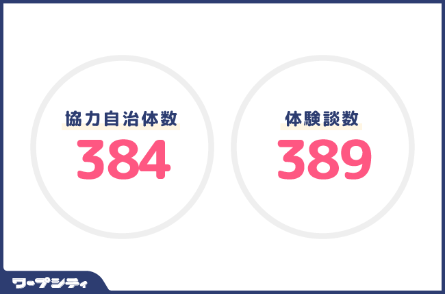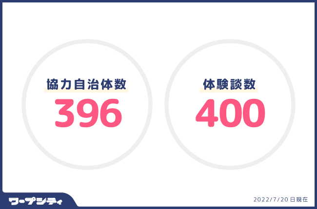 弊社が運営するポータルサイト「ワープシティ」は、2022年7月20日現在、ご協力いただいている全国396自治体の支援制度と、400名の移住体験記事を掲載しております。