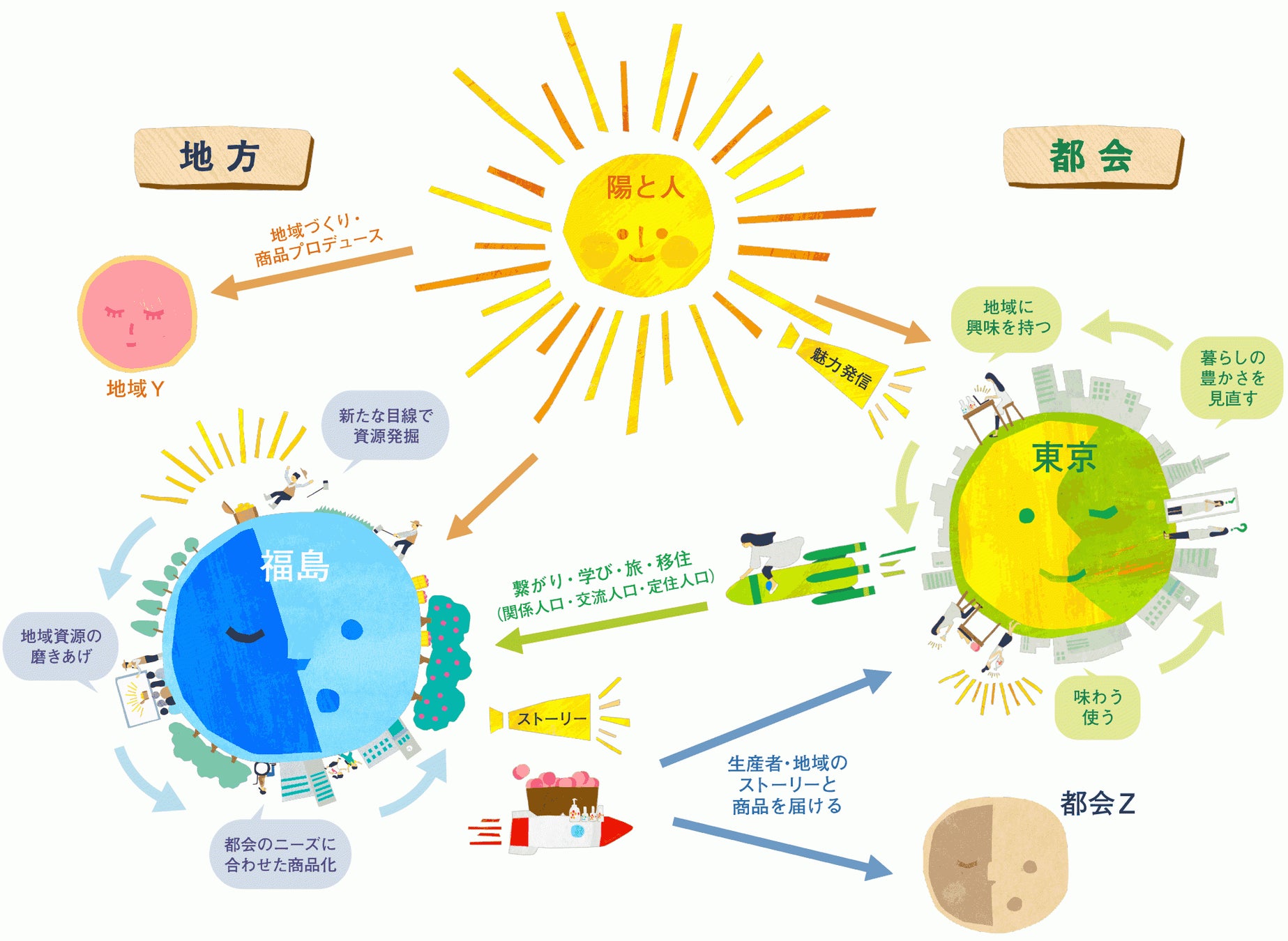 陽と人は「しあわせ・笑顔・豊かさの循環」をビジョンとして眠ったままの地域資源を見つけ、価値あるものへと編集し、地域と都市でしあわせが循環する社会をつくりを目指す会社です。
