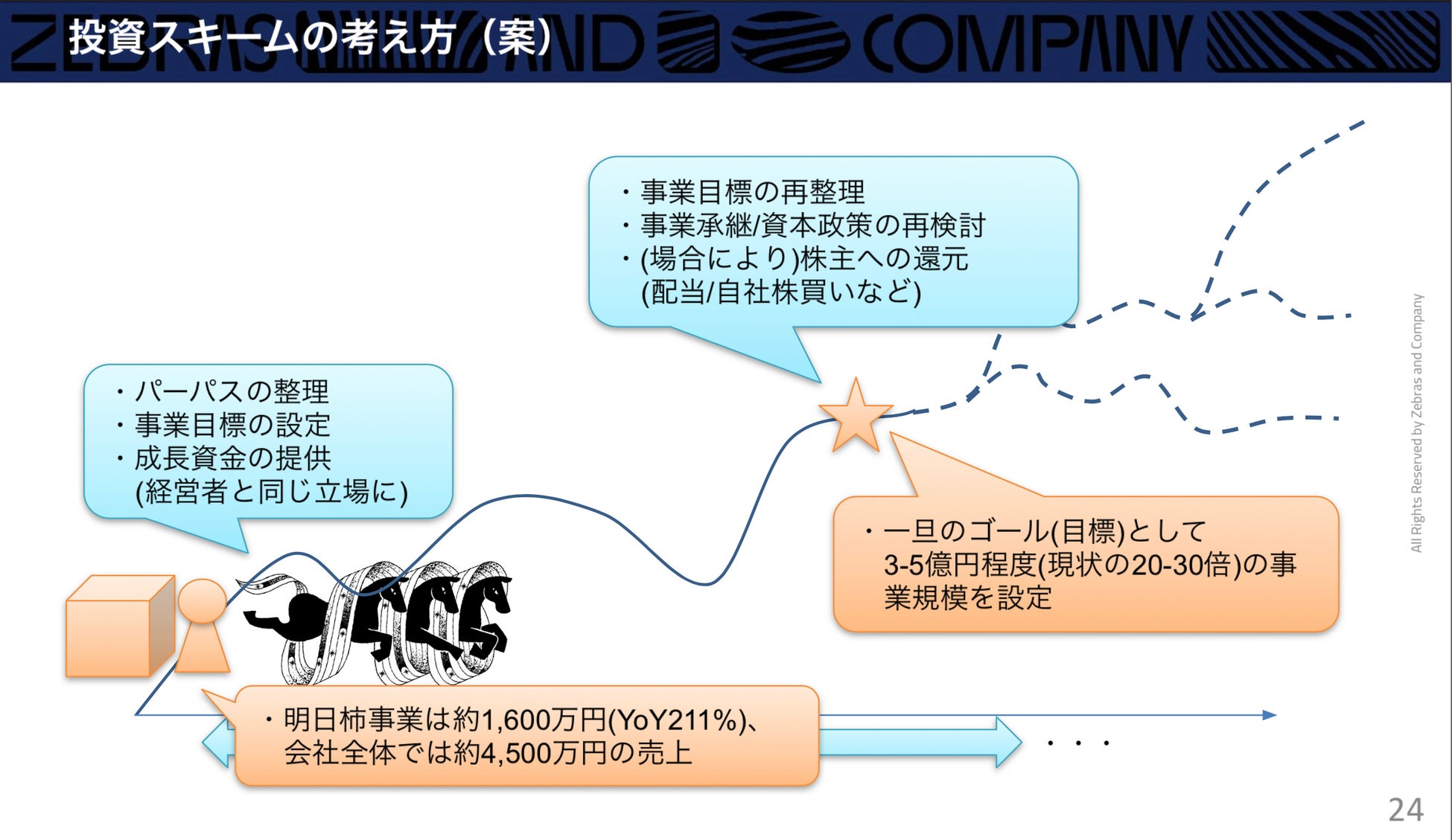 「Different scale, Different future」をテーマに、誰もが社会課題解決と持続的で健康的な企業経営に挑戦できる「優しく健やかで楽しい社会」を目指し投資と経営支援を行う会社です。投資・経営支援、行政や金融企業との連携、「ゼブラ企業」に関するリサーチと情報発信を通してゼブラ的経営を体系化し、「ゼブラ企業」という概念が全ての企業にインストールされる世界を目指しています。