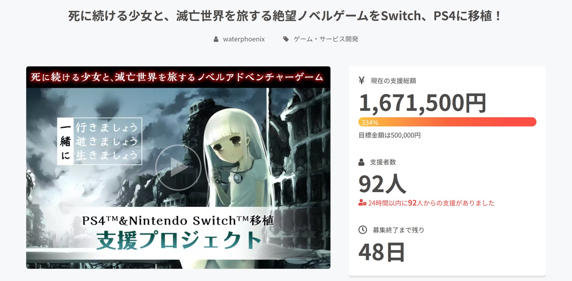 死に続ける少女と、滅亡世界を旅する絶望ノベルADV「一緒に行きましょう逝きましょう生きましょう」のSwitch、PS4移植支援クラウドファンディング 開始5日目で400%達成!