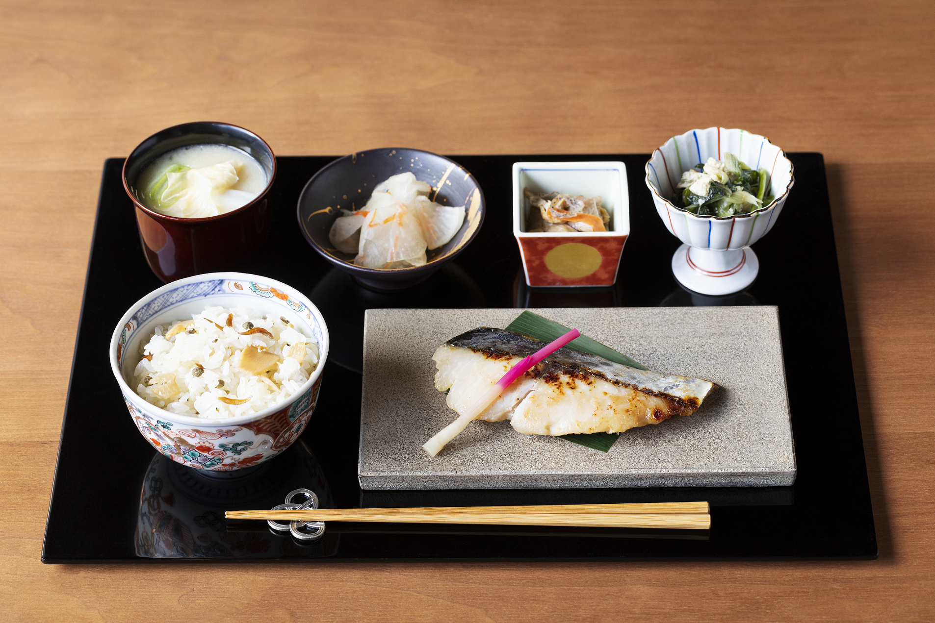 メニュー:①ちりめん竹の子ご飯 ②京さわらの西京焼き ➂京風味噌汁 ④ずいきの炊いたん ⑤大根とゆず皮の甘酢和え ⑥小松菜と京揚げの煮びたし