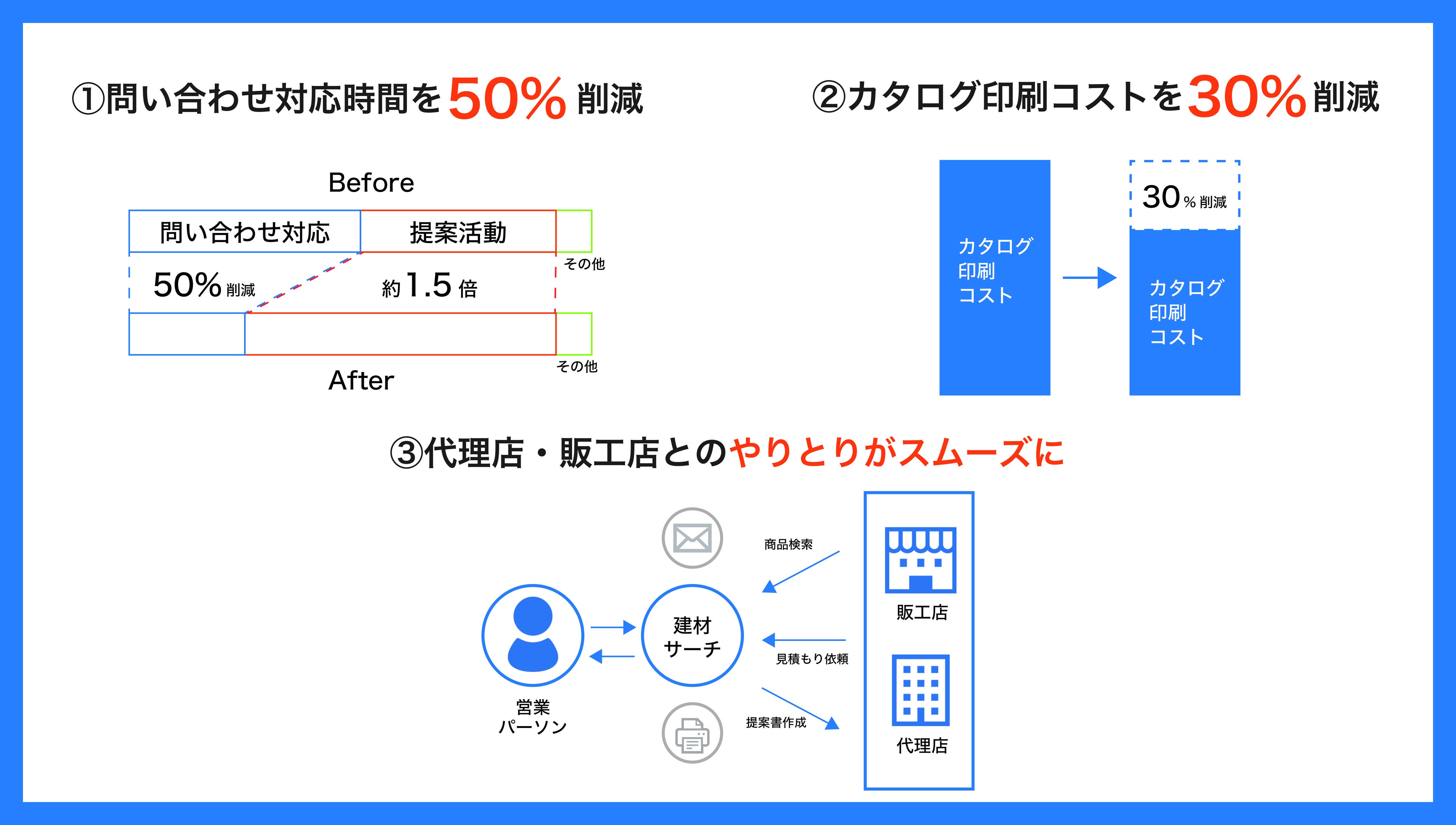 そこで、建材メーカーの営業パーソンが直面する商品情報検索の煩雑さの課題を克服するべく、問い合わせ対応時間を1日2時間削減する、建材商品の一括検索サービス「建材サーチ」をリリースいたしました。