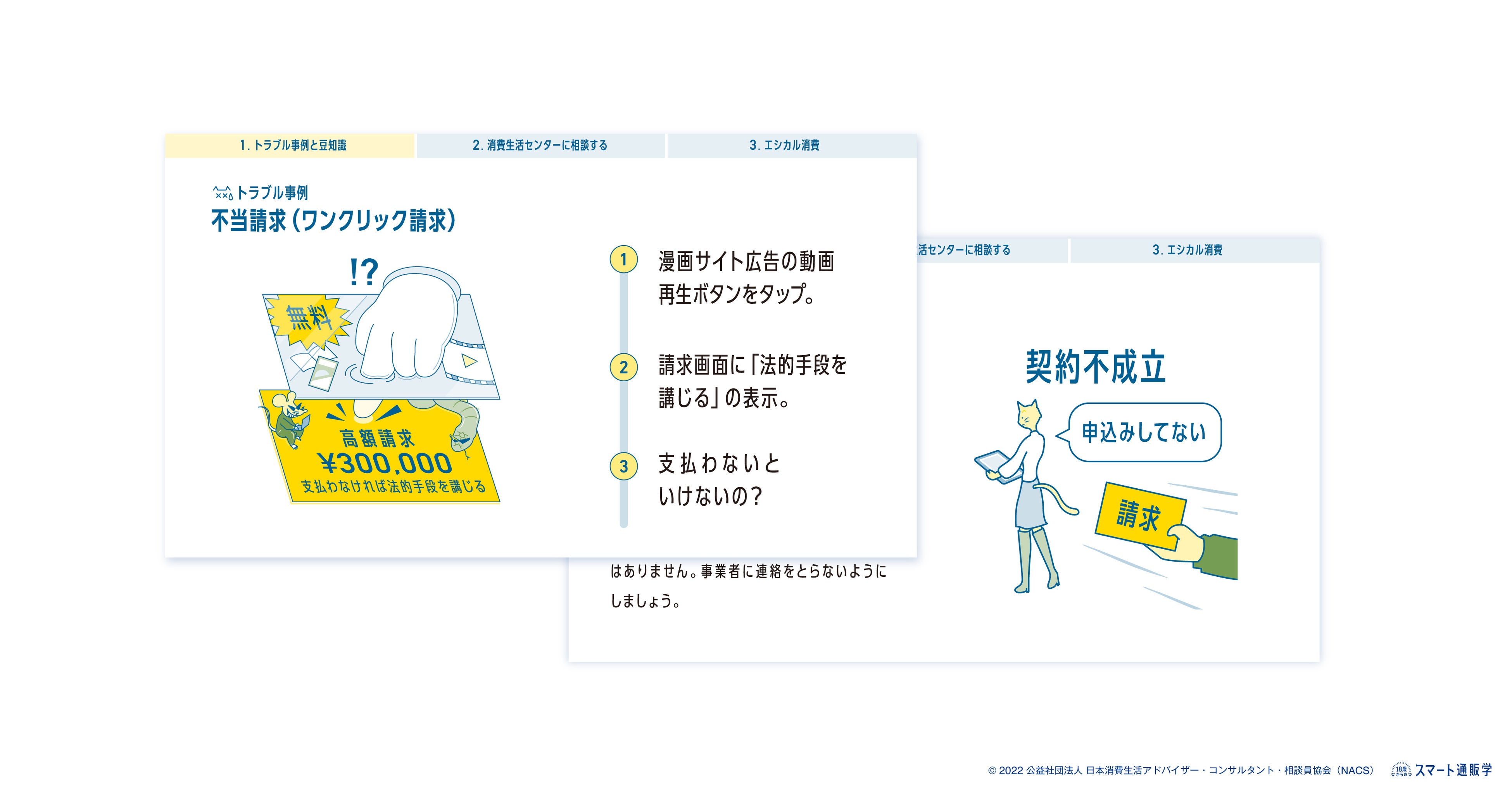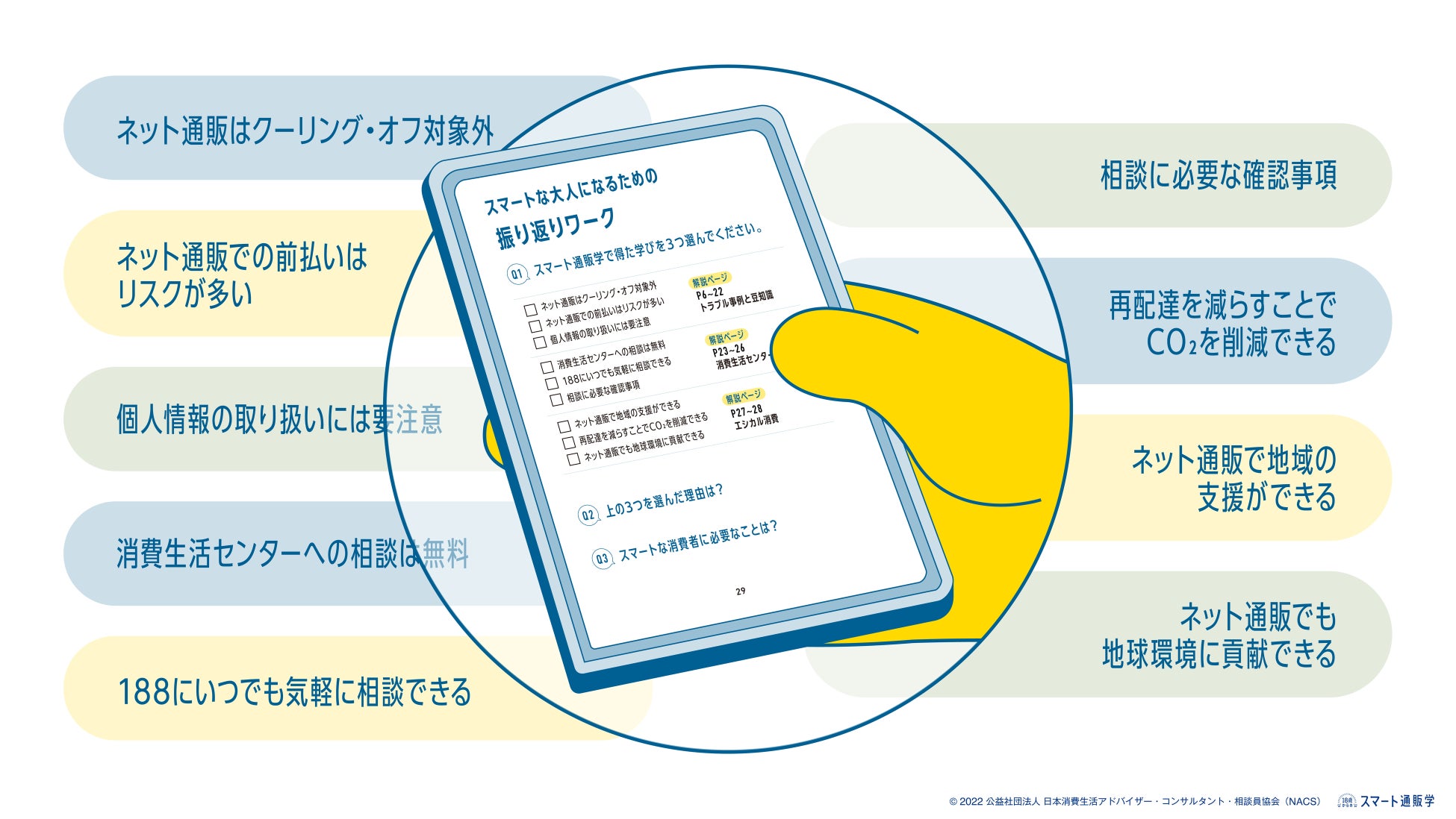 「18歳からのスマート通販学」は、インターネット通販における消費者トラブルを防ぐことを目的としています。そのための啓蒙・教育活動として、「18歳からのスマート通販学」のコンテンツリソースを学校授業・講座・各種メディアで自由にご活用いただけます。
