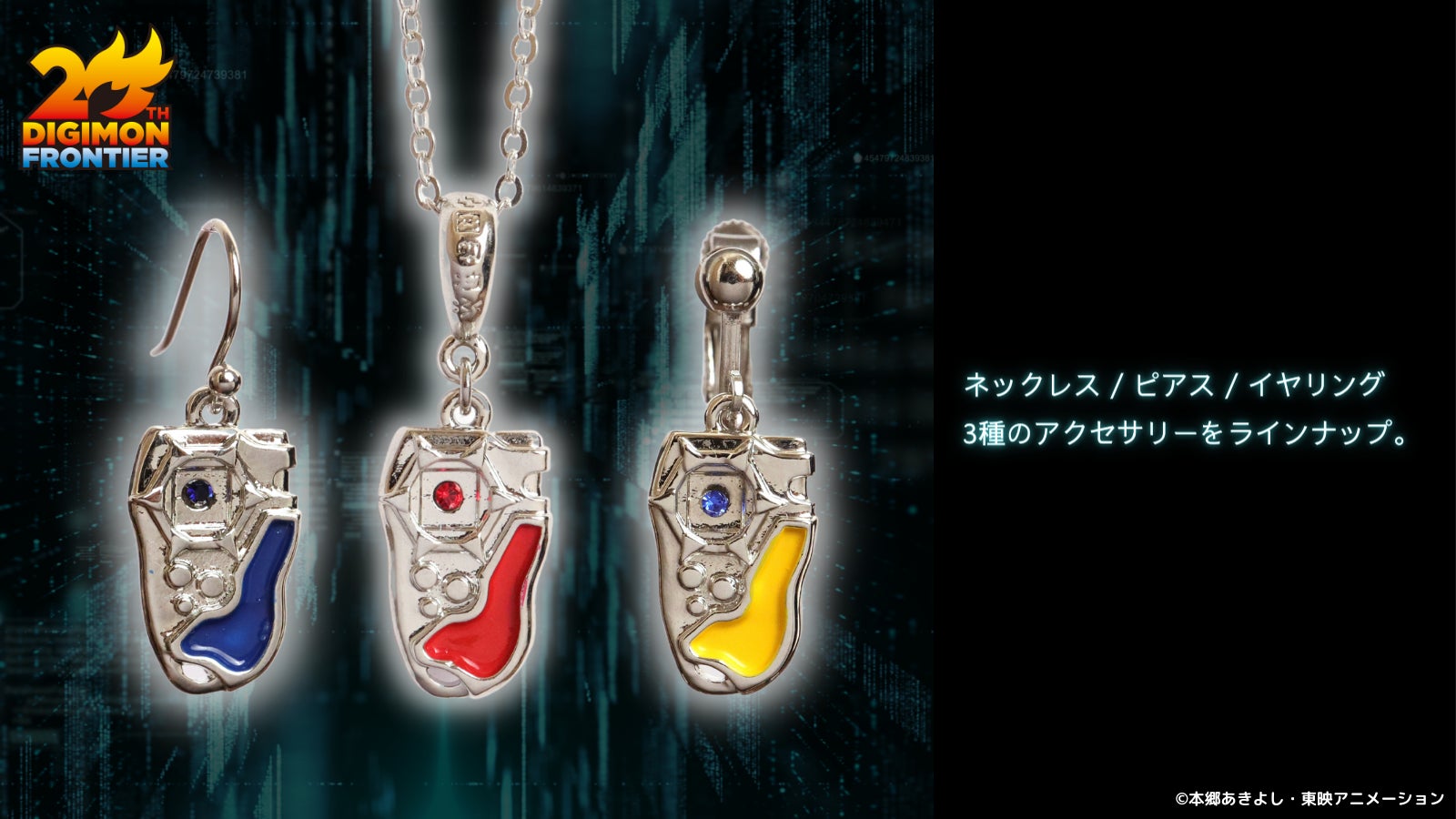 「ディースキャナ」をモチーフにしたアクセサリーは、TVアニメ「デジモンフロンティア」の放映20周年を記念したメモリアルアイテムです。