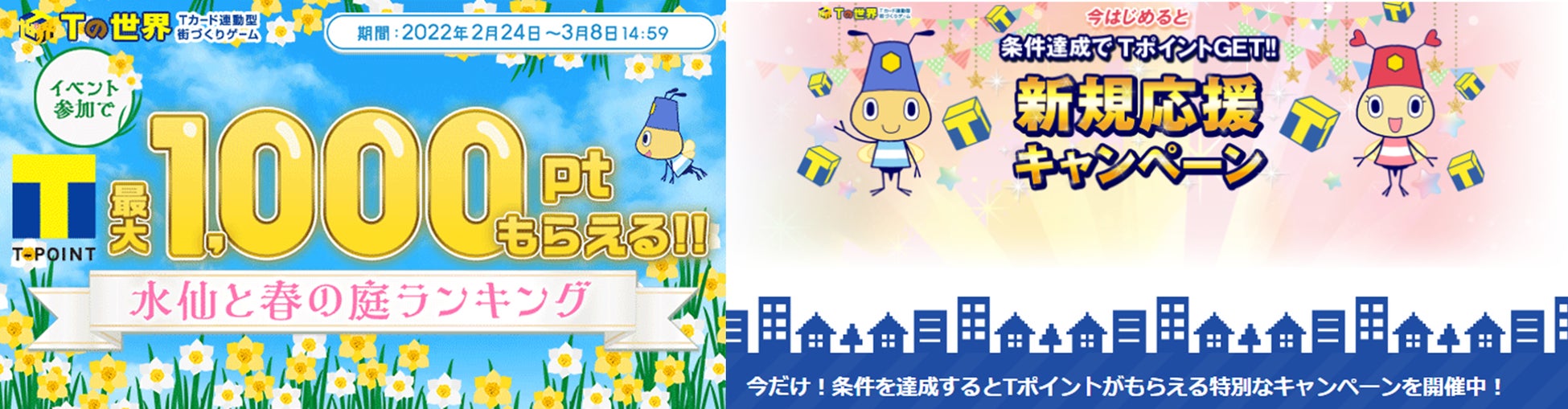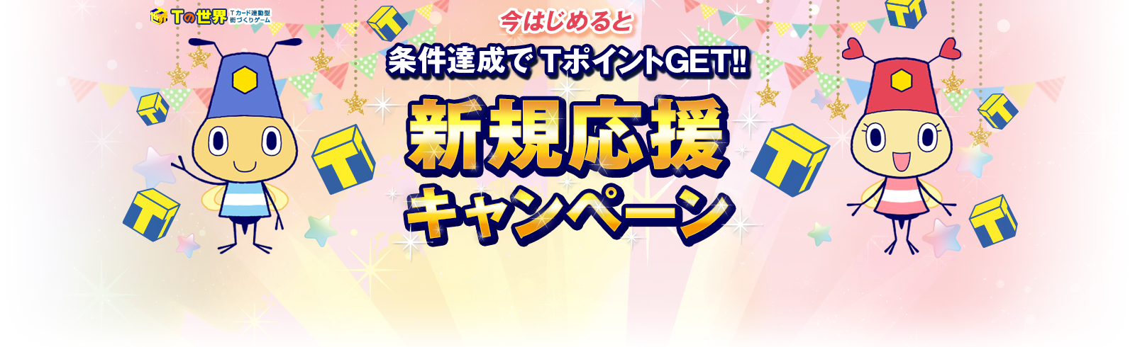 現在新規応援キャンペーンを開催中、期間中に条件を達成することで、TポイントやTの世界で使用できるゲーム内アイテムをプレゼント。