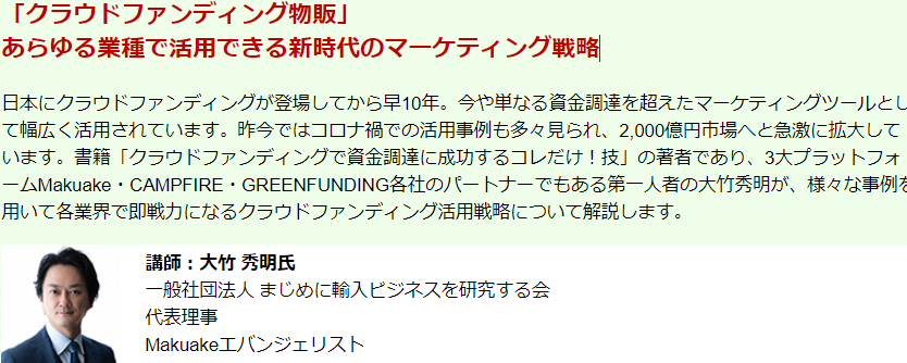 講演テーマ「クラウドファンディング物販 ~あらゆる業種で活用できる新時代のマーケティング戦略~」