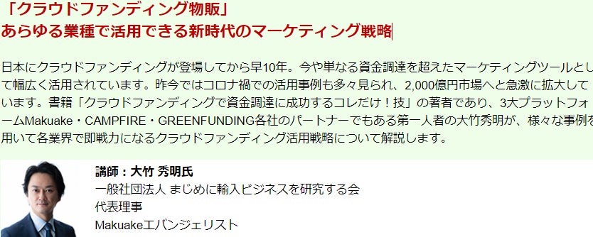 | 講演テーマ | クラウドファンディング物販 ~あらゆる業種で活用できる新時代のマーケティング戦略~ |