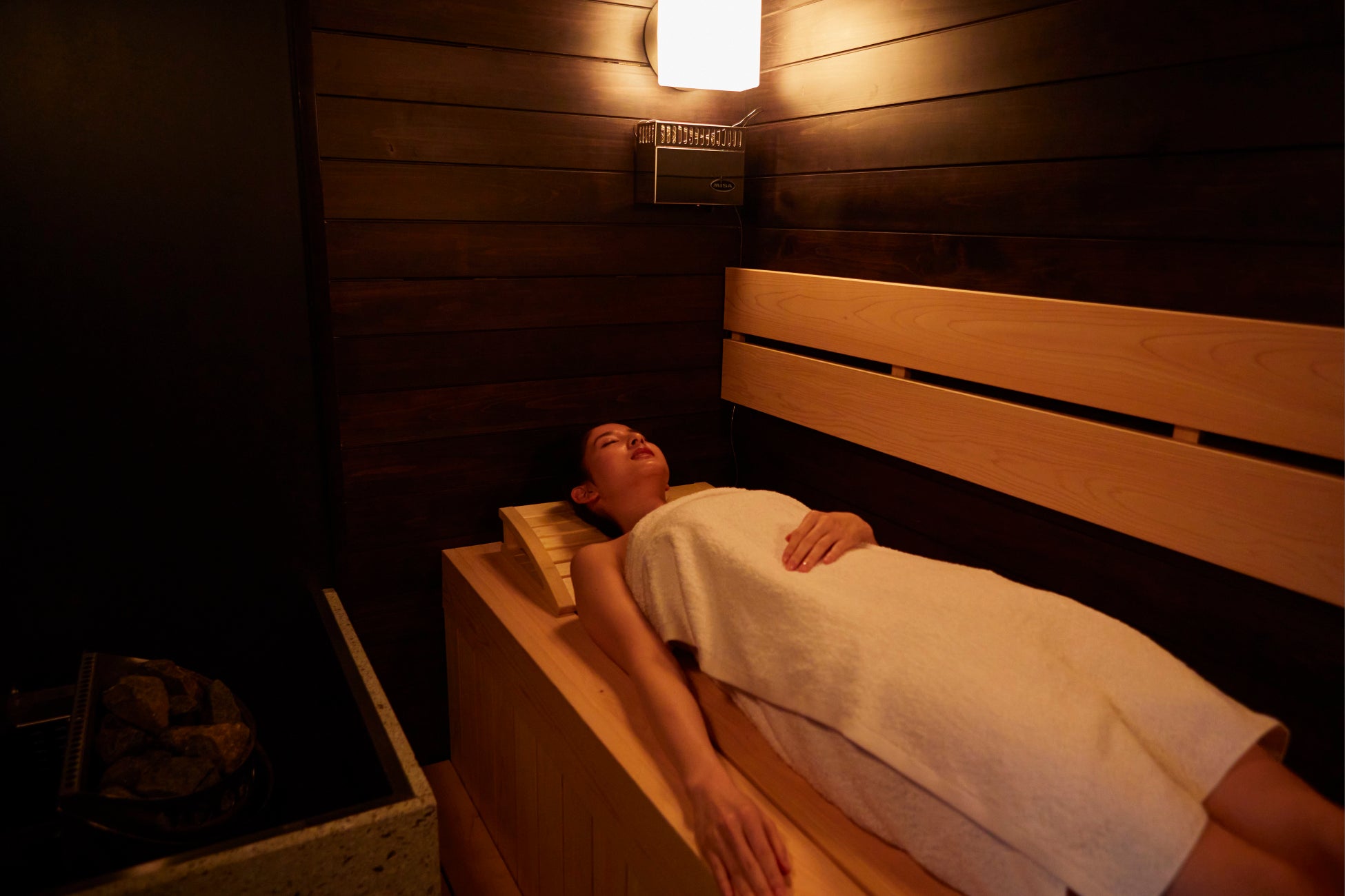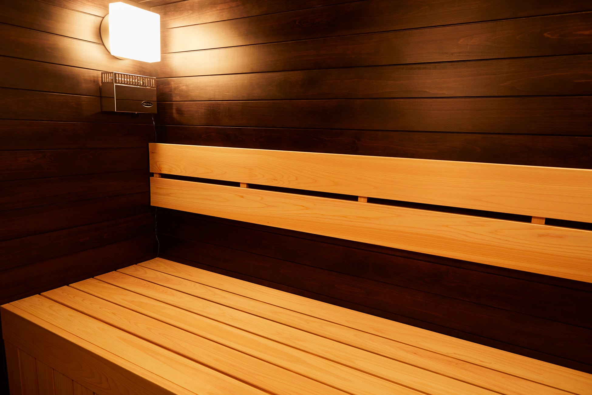 贅沢な総ヒノキ張りの室内は3人まで利用可能なゆったりとした広さとなっており、長さ2mのベンチには寝転ぶことができます。サウナ室内の温度、照明の明るさを自分で調整可能です。その日のコンディションに合わせてサウナ室内の環境をカスタマイズすることができます。