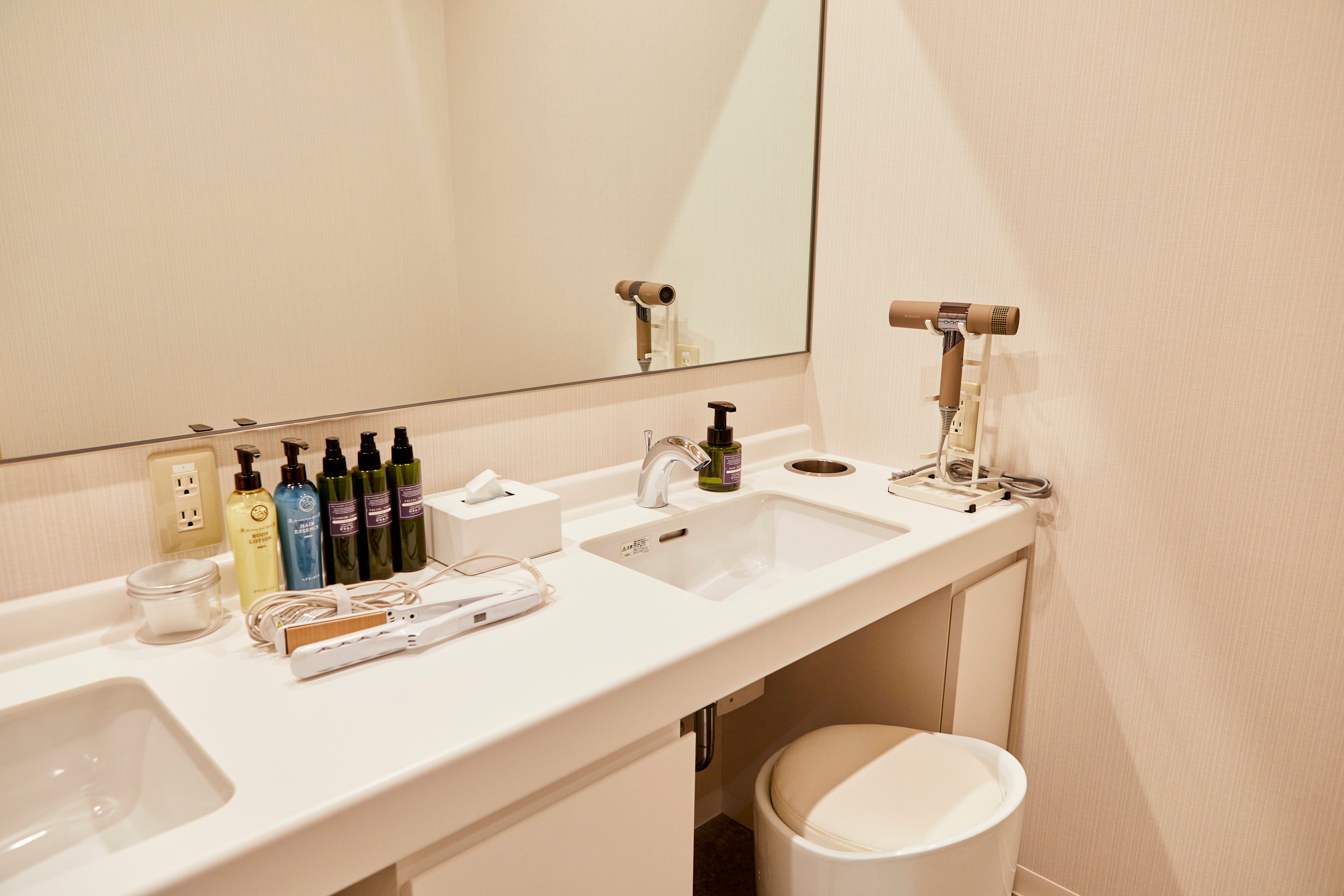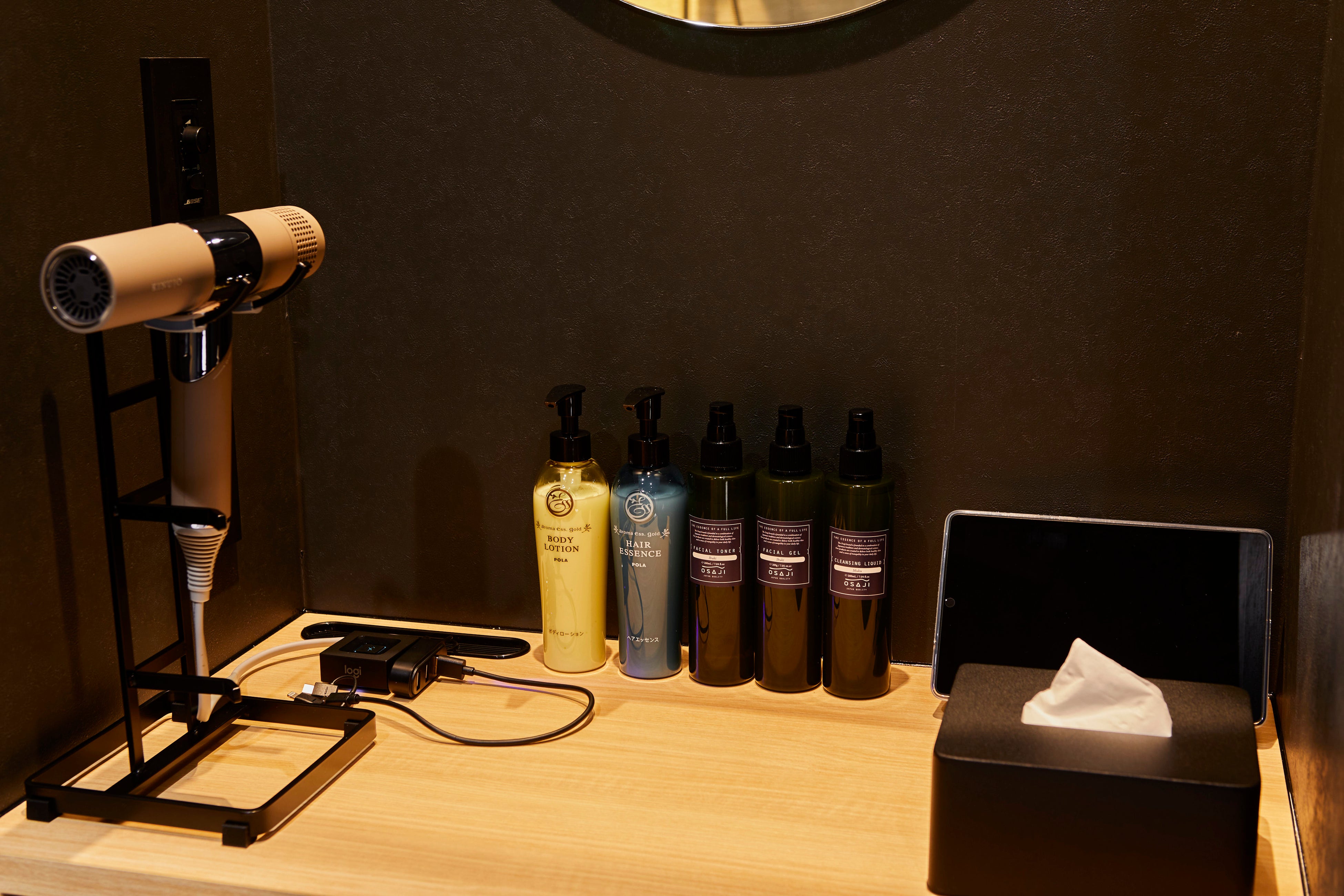 個室内には、シャンプー・ボディクリームなどのアメニティが常備されており、手ぶらで来店できます。スキンケア/ヘアケアアイテムにこだわりを持ち、またヘアドライヤーには、女性に人気の「絹女(KINUJO)」を採用するなど高品質で多彩なアメニティを設置しております。