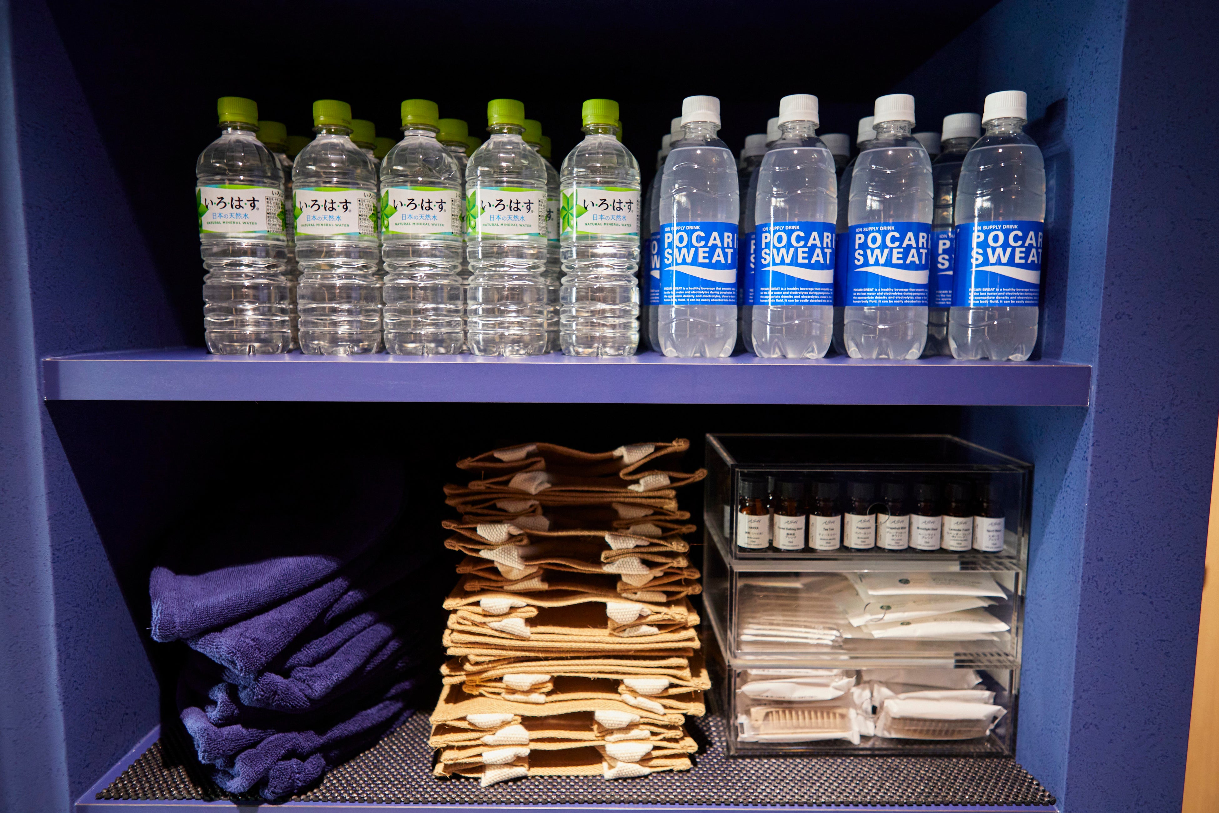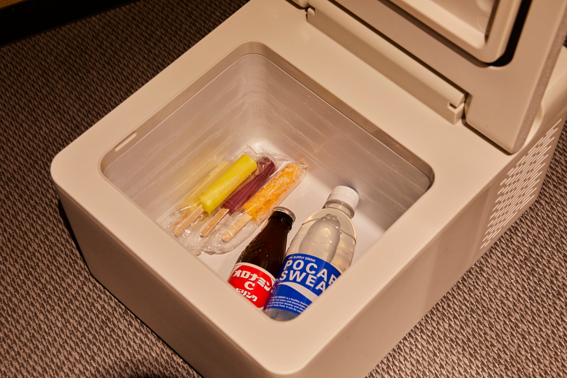 予約者専用エリア内の冷蔵ケースにご用意している、ミネラルウォーターやポカリスエットなどを個室に持ち込んで自由にお飲みいただけます。冷たい飲み物が苦手な方のためにも、常温ドリンクもご用意しております。また個室内の冷凍庫内に、アイスキャンディを2本ご用意しております。インフィニティチェアでととのいながら頬張るアイスキャンディは格別の味わいです。