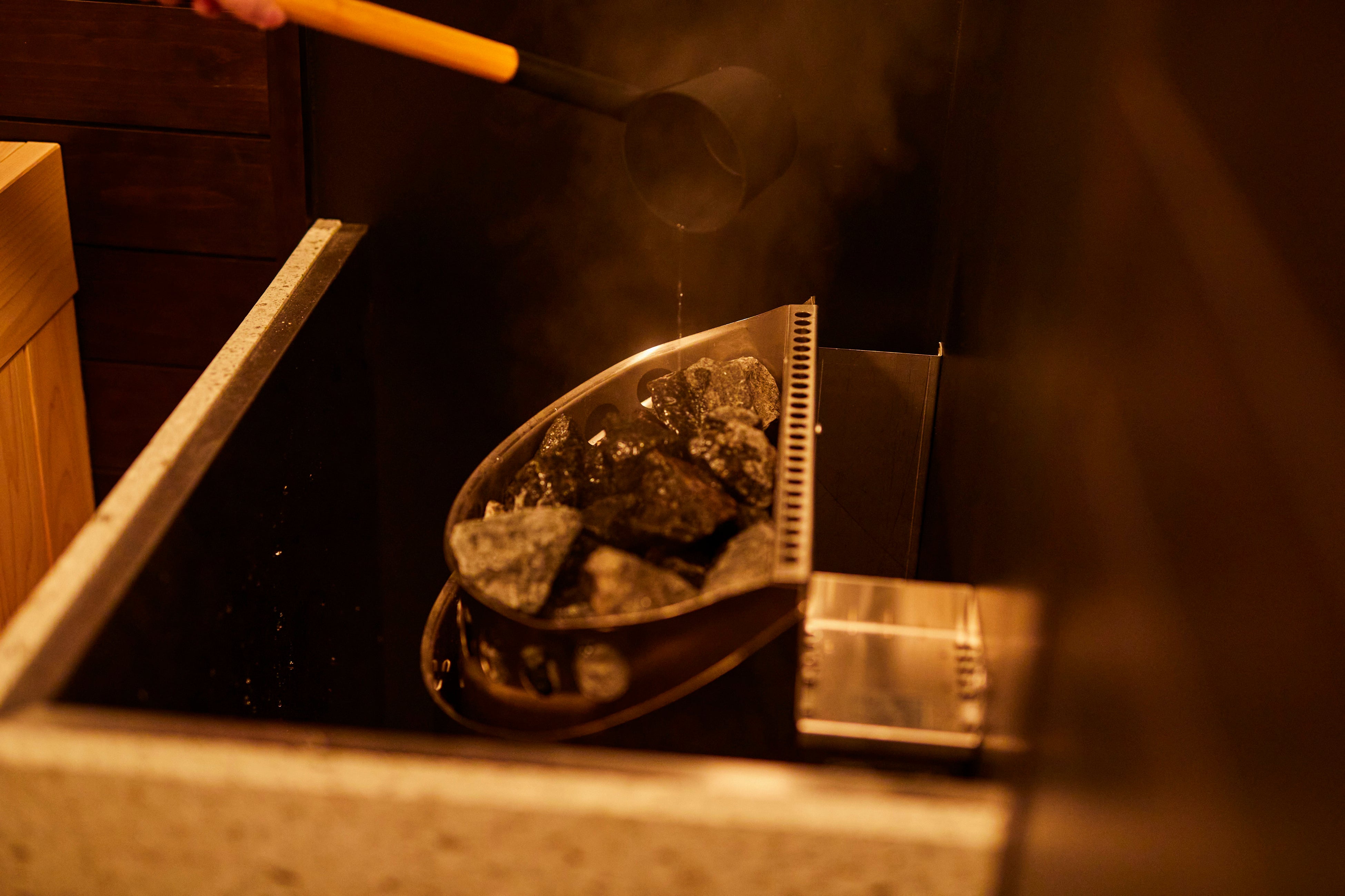 MISA製のサウナストーブにて、アロマ水のセルフロウリュを楽しめます。アロマ水は六種類から選べ、自分の好きな香りで「ととのう」ことができます。