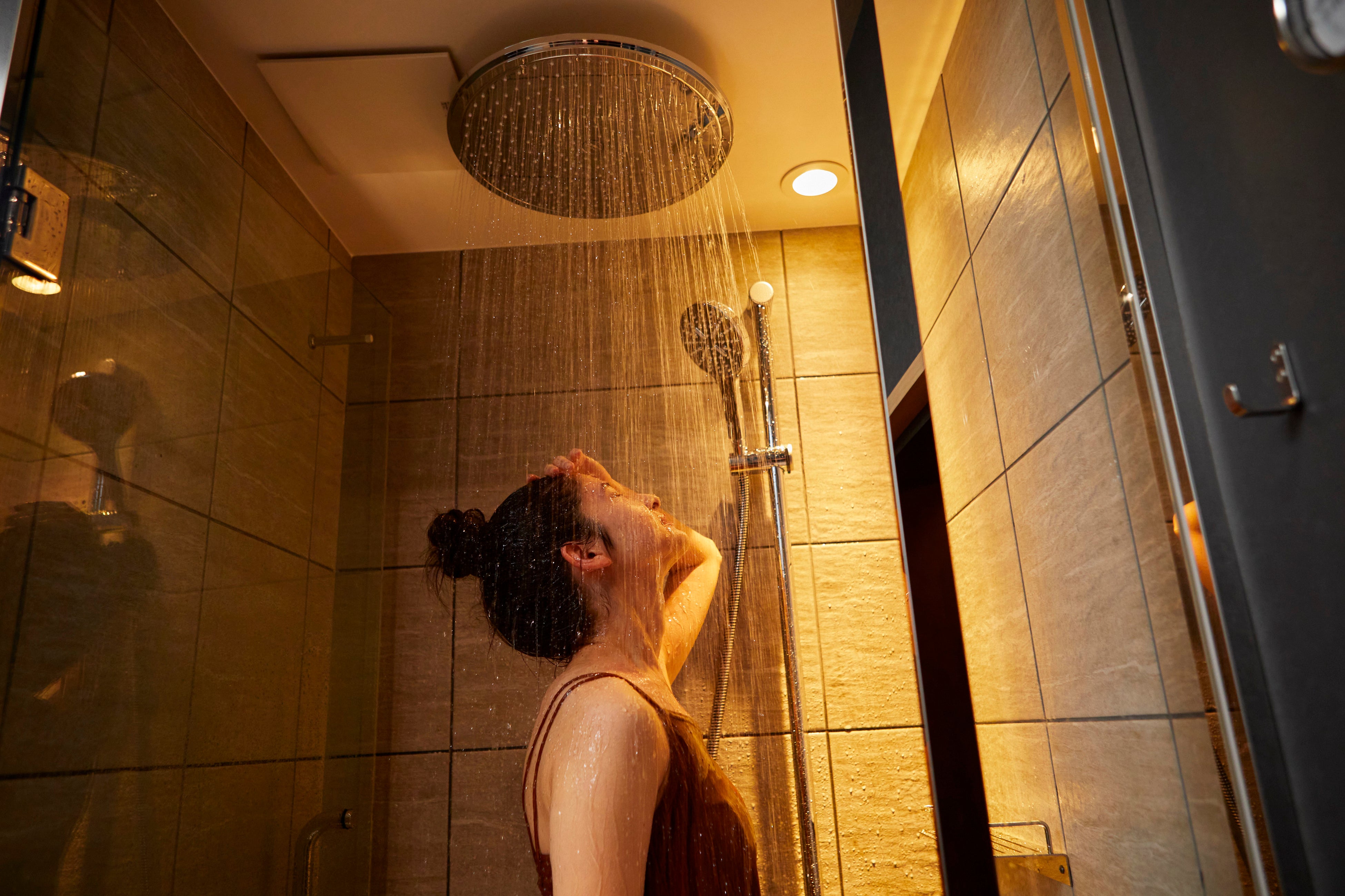 サウナの後は、大口径のオーバーヘッドシャワーから、チラー(冷却機)によって15℃に冷やされた水を全身に浴びることでクールダウンします。