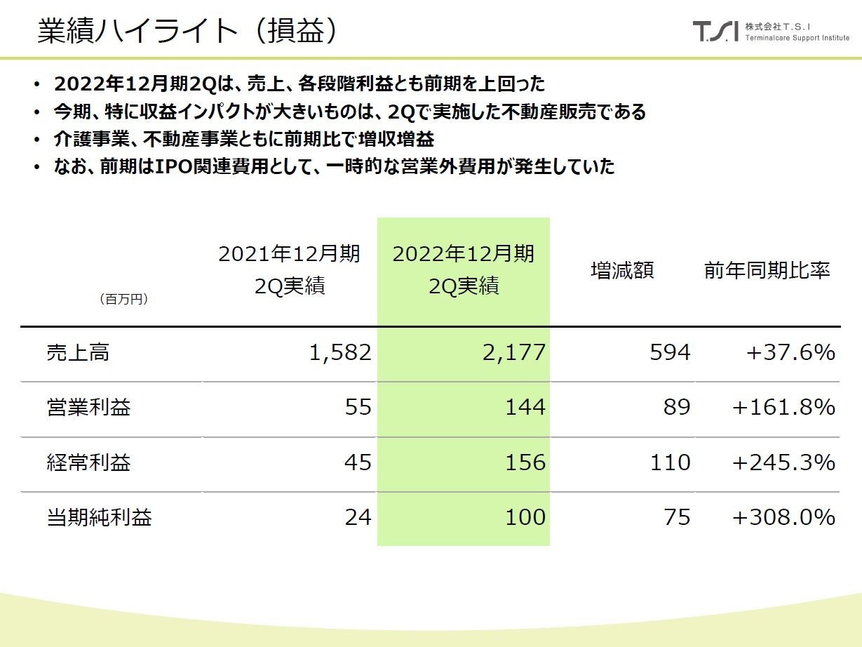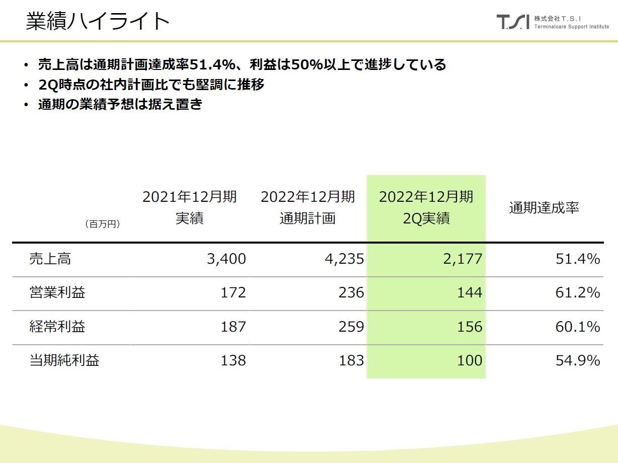 「愛ある日々のお手伝い」を理念にサービス付き高齢者向け住宅「アンジェス」を運営する株式会社T.S.I(本社:京都市西京区、代表取締役社長:北山忠雄)は、2022年8月12日、2022年12月期第2四半期決算を発表しました。